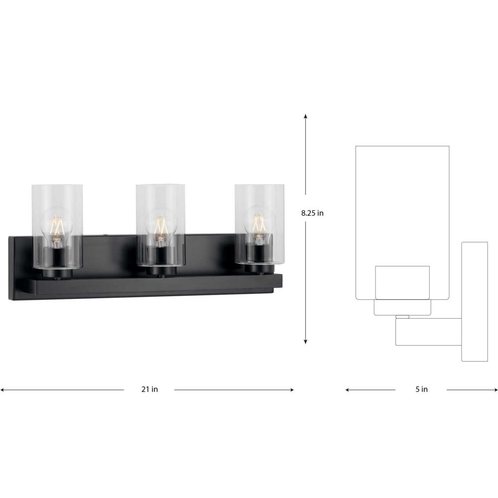 Update any bathroom with the Goodwin Vanity Light, whose clean design seamlessly blends with todays modern decor. Finished in classic matte black, its crisp lines highlight the modern profile of the rectangular backplate that supports columns of clear glass shades for bright illumination in the bath. This versatile fixture can be mounted with glass facing up or down, casting even illumination in any setting.