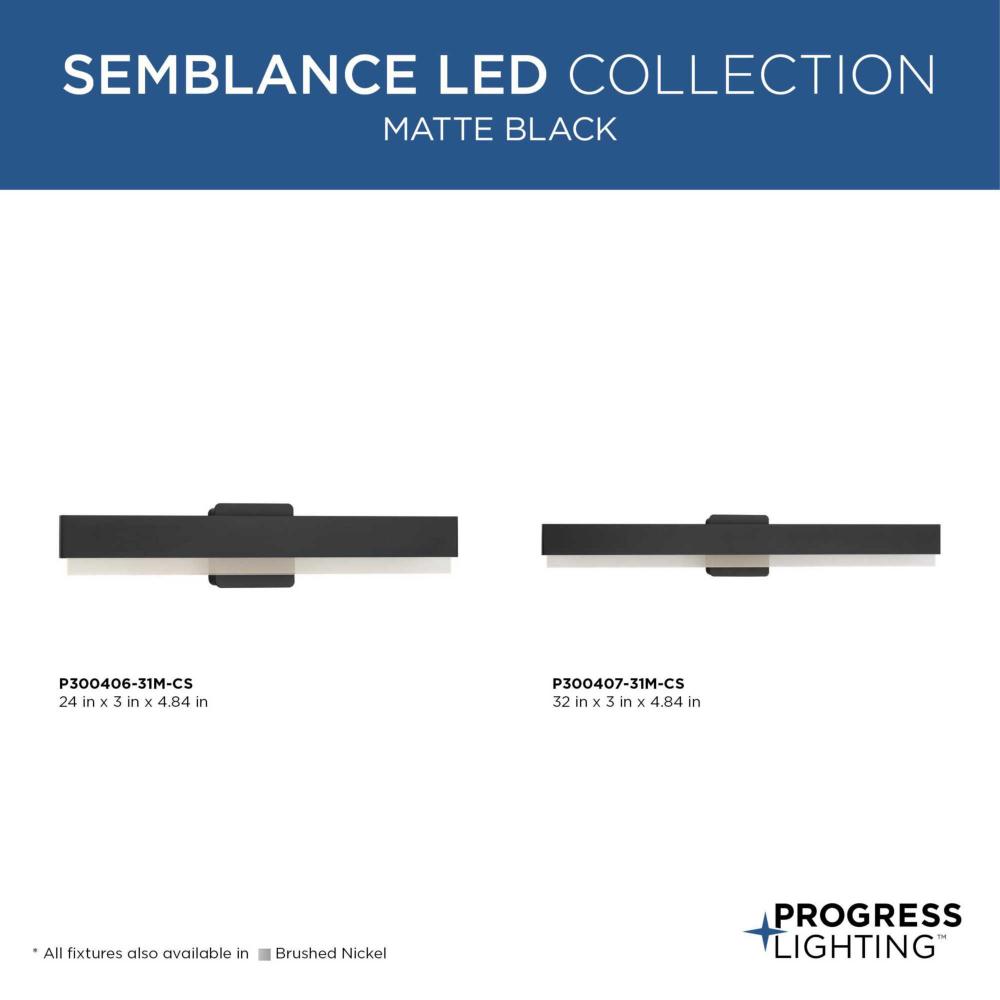 Add contemporary style to bathrooms with the Semblance Collection LED Large Linear Vanity light. This versatile design is ideal for any bathroom in contemporary or modern commercial or residential settings. Progress Lighting products are designed for exceptional quality, reliability, and functionality. Anchored by a sleek, square backplate, a handsome rectilinear metal bar holds an acrylic diffuser along its length, creating edge-lit illumination. Finished in crisp matte black. Color selectable technology offers a choice of 3000K, 4000K or 5000K at a flip of a switch to perfectly illuminate surroundings with multi-directional, energy-efficient light. This versatile design is ideal for any bathroom in contemporary or modern commercial or residential settings. Progress Lighting products are designed for exceptional quality, reliability, and functionality.