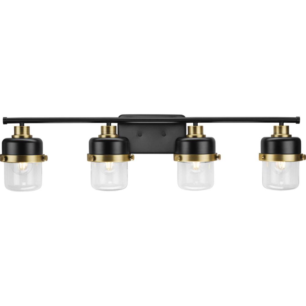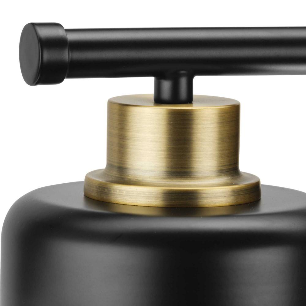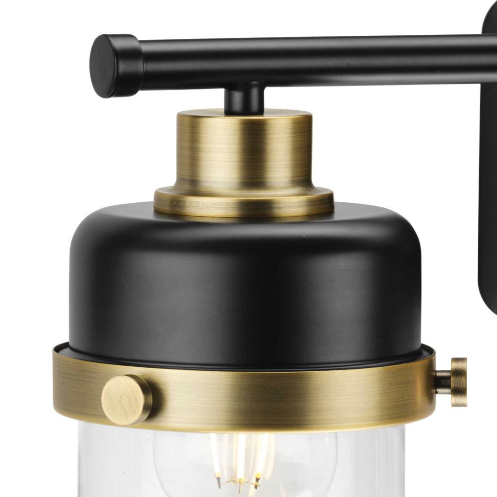 The Beckner Collection reflects mid-century and industrial design, with mechanical knobs and hooded lights finished in crisp matte black accented by vintage brass. Beckner’s tactile appeal welcomes curiosity and adds depth to bathrooms and powder rooms in mid-century modern, transitional and urban industrial settings. An oblong backplate holds a rod which suspends its vintage-style shades complemented by clear glass, delivering bright illumination while adding a modern touch. This versatile fixture can be mounted up or down, increasing its design flexibility. cULus damp location listed, with a one-year warranty to guarantee your complete satisfaction. Progress Lighting products are designed for exceptional quality, reliability, and functionality.