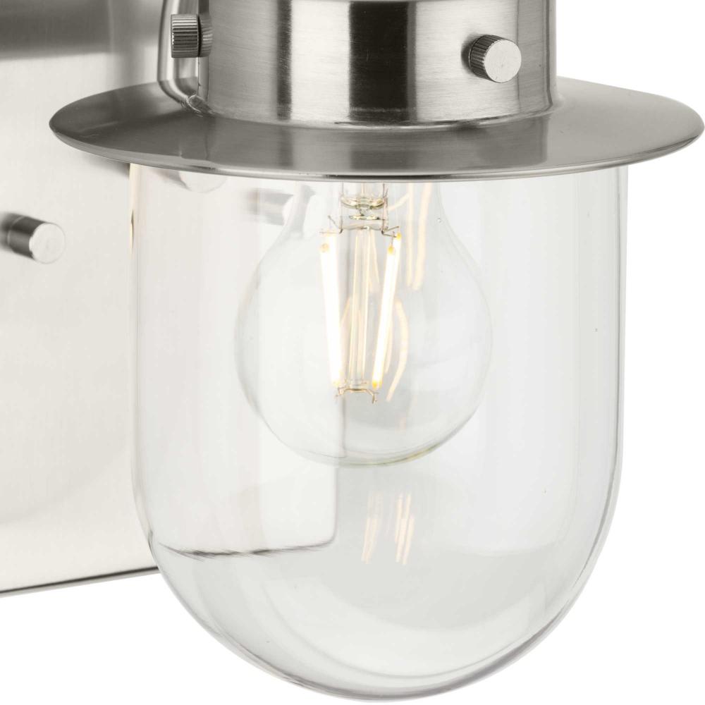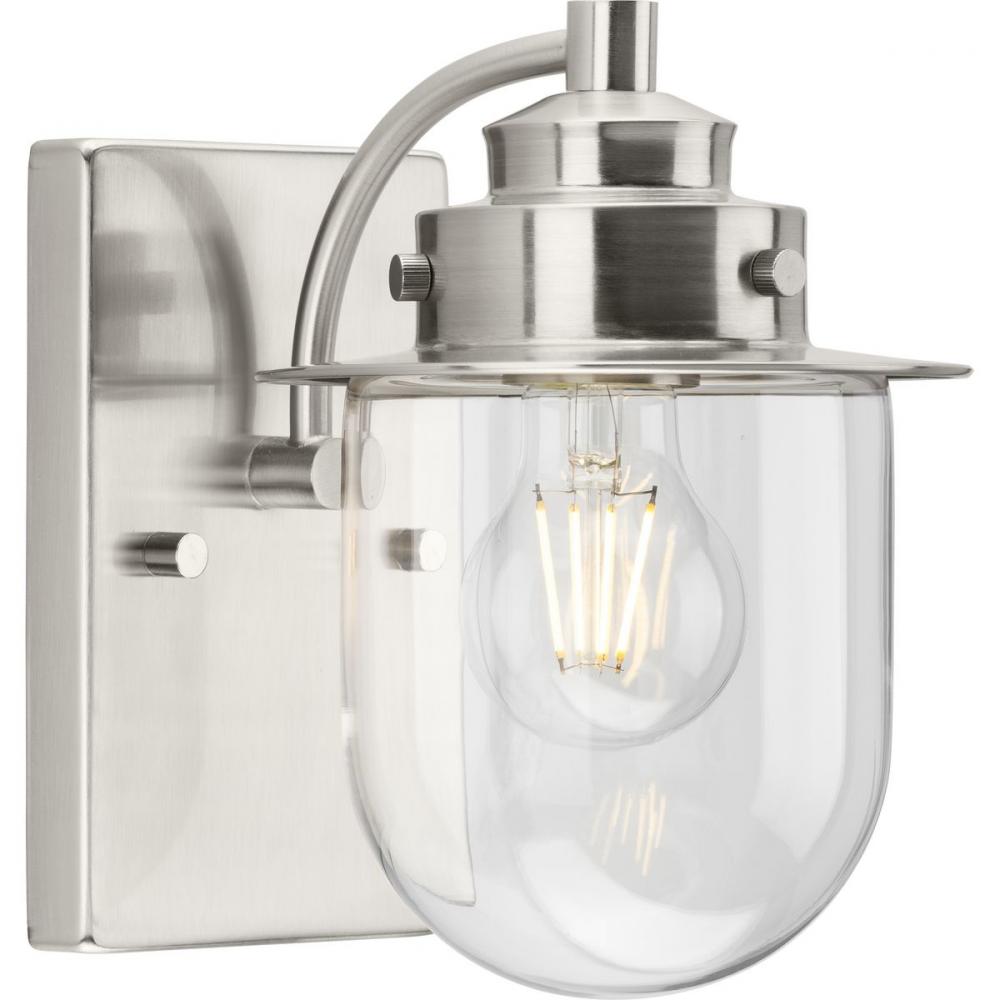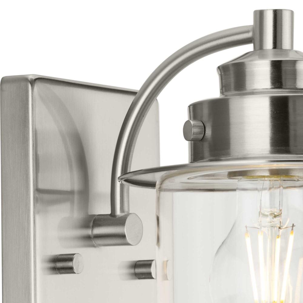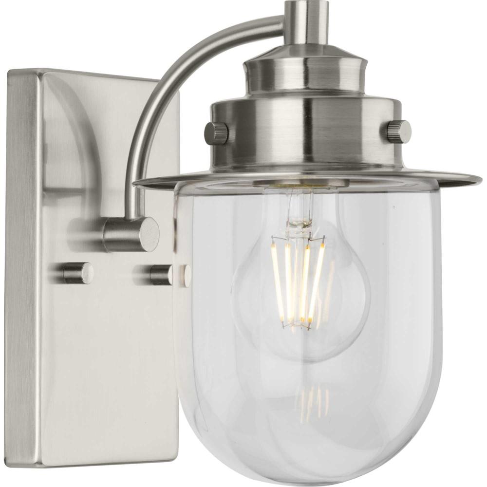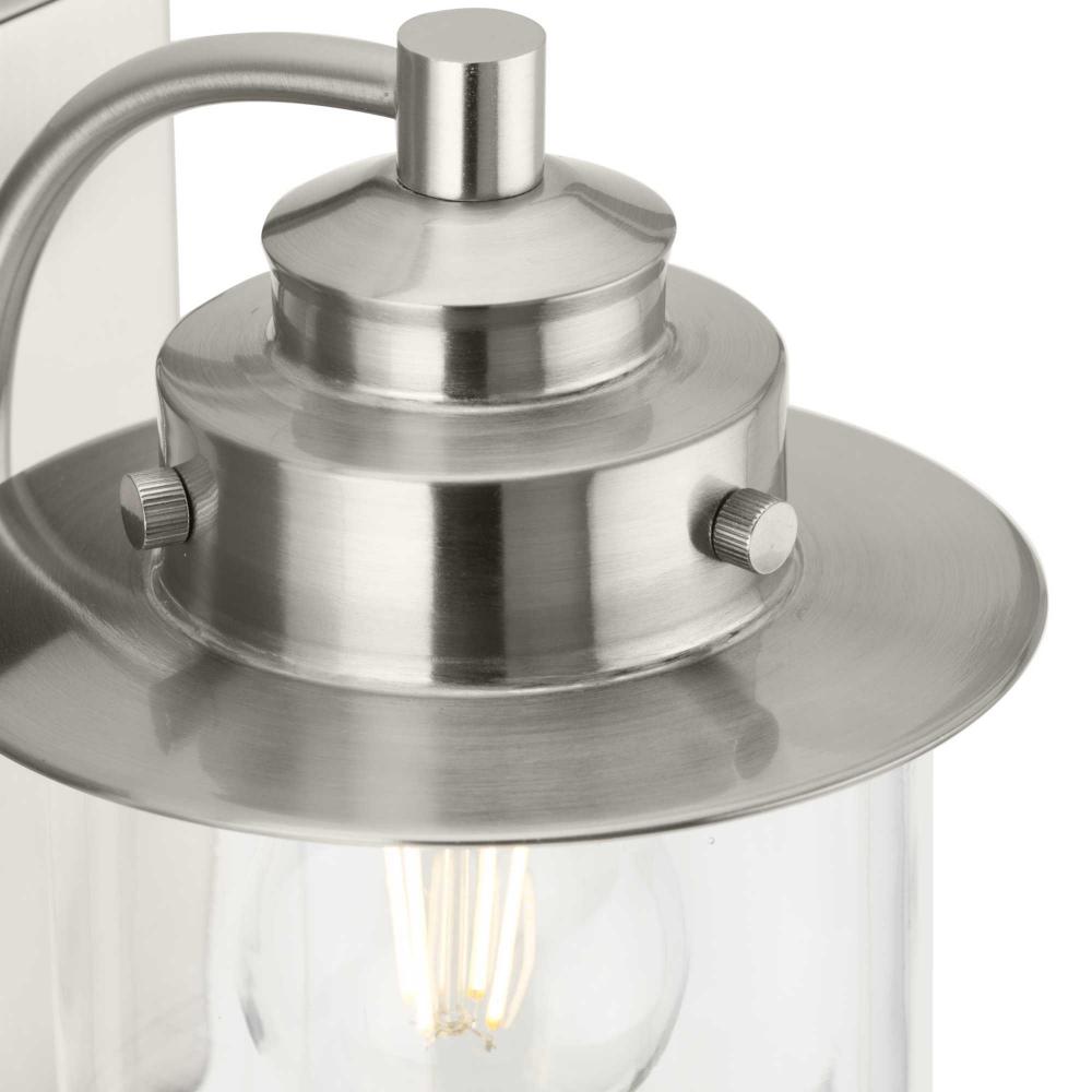 The nostalgic Northlake Collection combines classic design influences with nautical inspiration. Finished in brushed nickel, the rounded diffuser and layered caps are reminiscent of floating buoys and weekends on a mountain lake. A clear glass shade casts a pleasing glow in bathrooms, powder rooms, hallways and living rooms in coastal and transitional settings. This versatile fixture can be mounted up or down, increasing its design flexibility. It is cULus damp rated and has a one-year warranty to guarantee your complete satisfaction. Progress Lighting products offer exceptional quality, reliability, and functionality. .