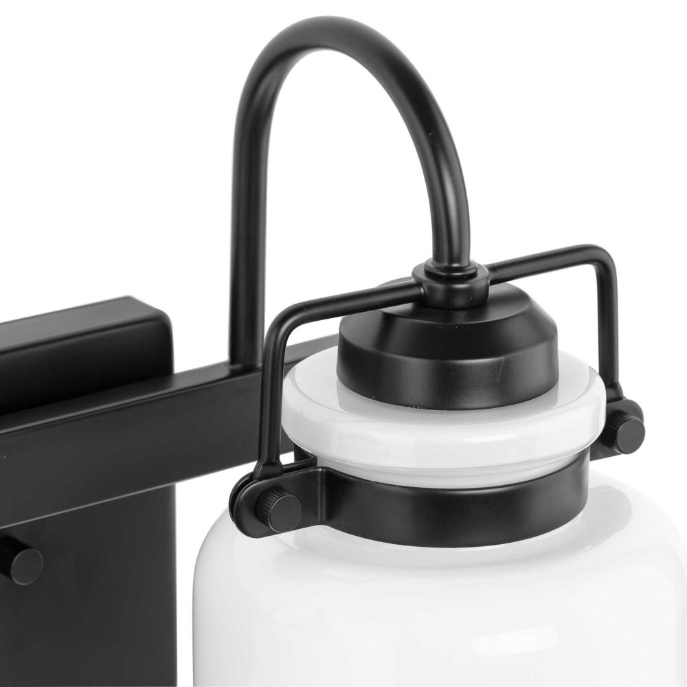 Distinctive mechanical details establish a nostalgic flair in the elegant Fessler collection. Opal glass shades deliver comfortable diffuse illumination to bathrooms and powder rooms in transitional and farmhouse settings. The decorative frame is coated in a crisp matte black and features authentically crafted hardware elements that complements the curved opal shades. This versatile fixture can be mounted up or down, increasing its design flexibility. It is cULus damp location listed, with a one-year warranty to guarantee your complete satisfaction. Progress Lighting products are designed for exceptional quality, reliability, and functionality. .