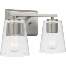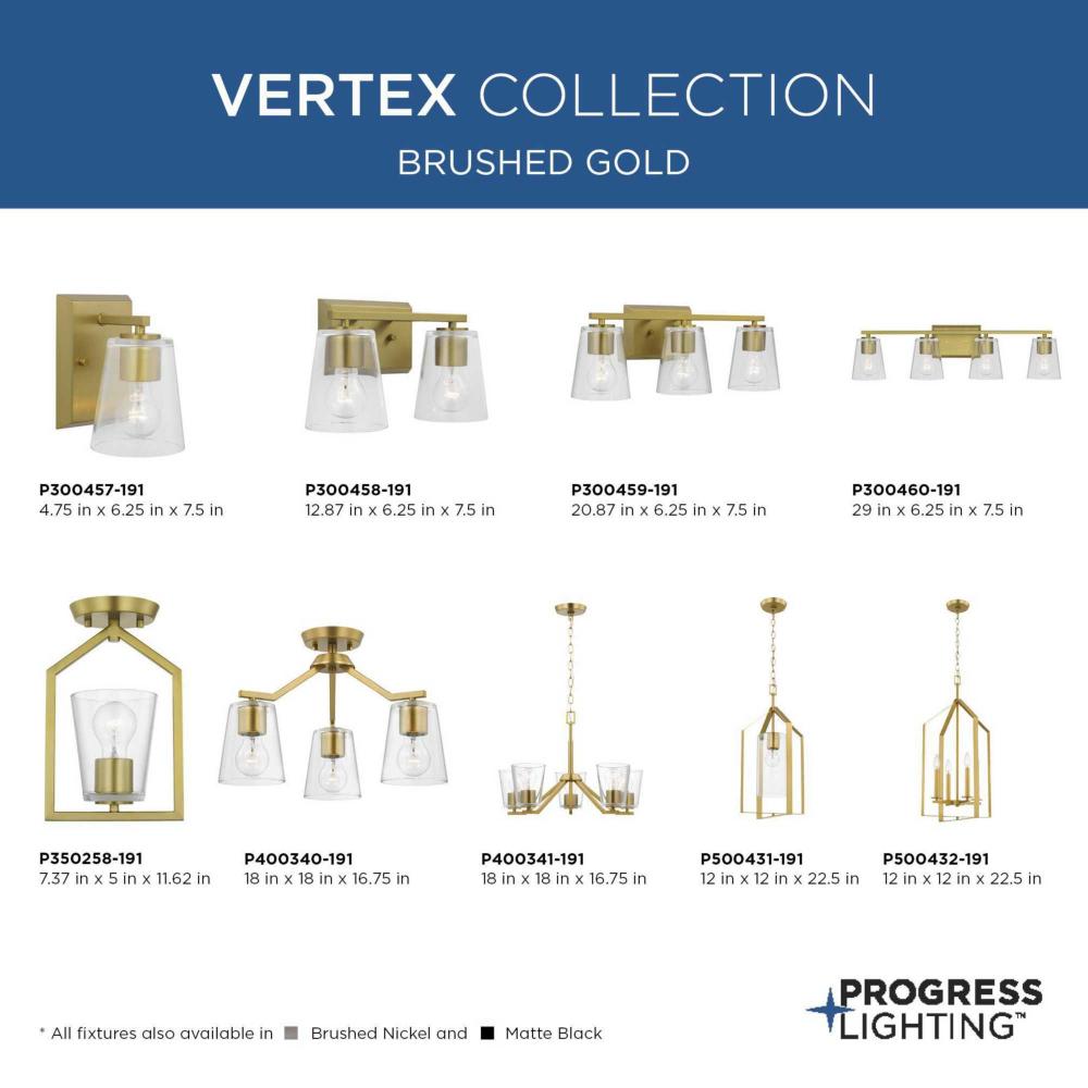 Elegantly extended, the Vertex Collection is composed of angular forms finished in soft brushed gold to create a bold design that perfectly complements modern interiors. Glass shades delivers bright illumination to bathrooms and powder rooms in contemporary settings. This versatile fixture can be mounted up or down, increasing its design flexibility. It is cULus damp rated and has a one-year warranty to guarantee your complete satisfaction. Progress Lighting products offer exceptional quality, reliability, and functionality. .