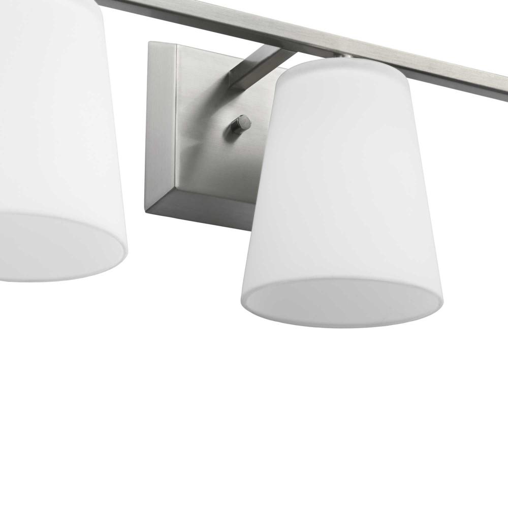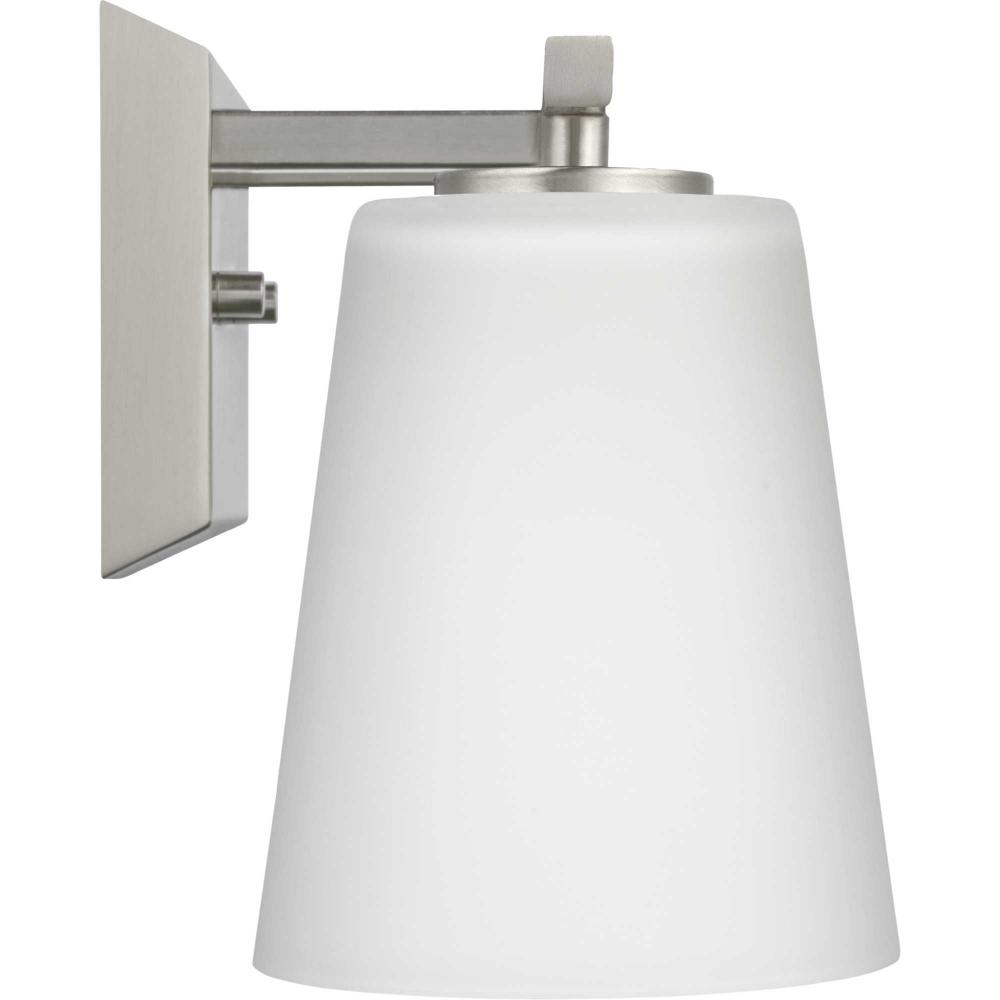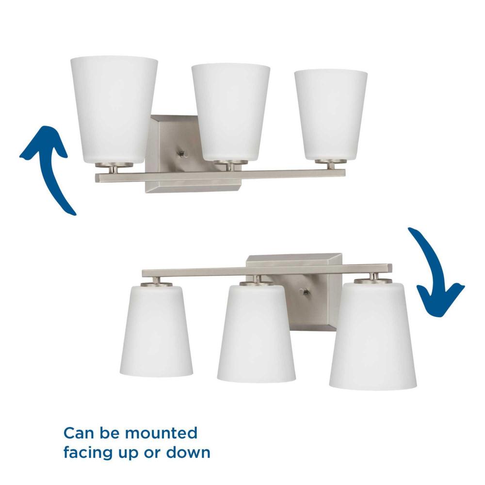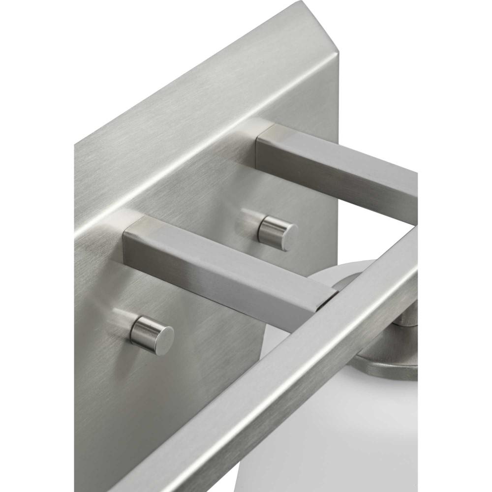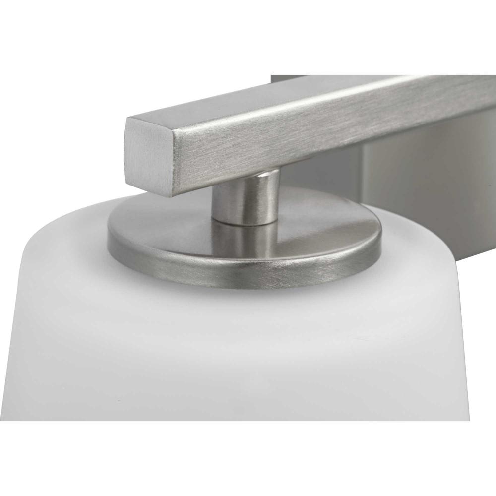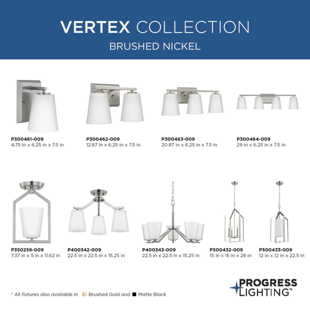 Elegantly extended, the Vertex Collection is composed of angular forms finished in subtle brushed nickel to create a bold design that perfectly complements modern interiors. Glass shades delivers bright illumination to bathrooms and powder rooms in contemporary settings. This versatile fixture can be mounted up or down, increasing its design flexibility. It is cULus damp rated and has a one-year warranty to guarantee your complete satisfaction. Progress Lighting products offer exceptional quality, reliability, and functionality. .