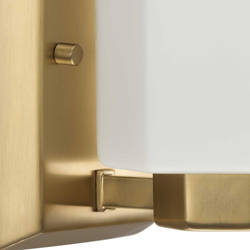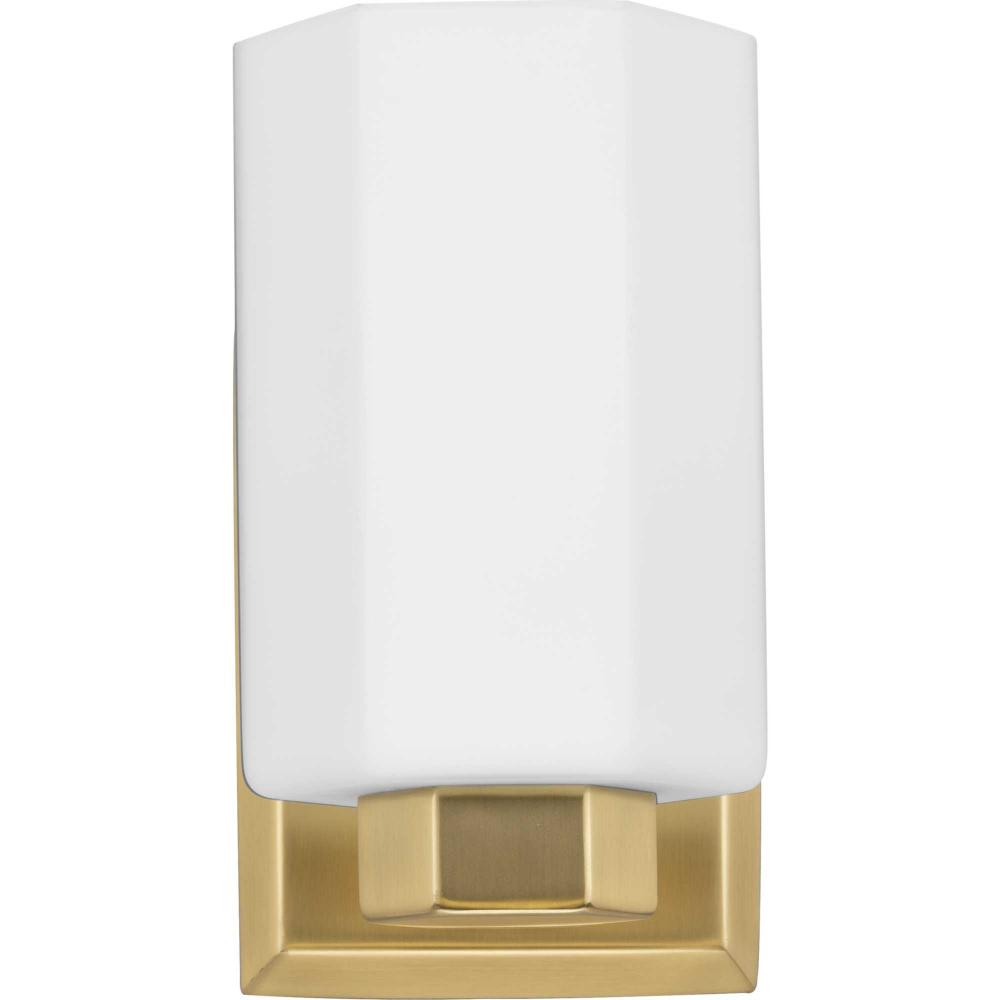 The Estrada One-Light Vanity Light features a hexagonal motif, one of the most beautiful patterns that occurs frequently in nature. This classic shape is experiencing a revival in popularity as it is both timeless and modern at the same time. A faceted opal glass shade is fitted atop a matching metal base finished in elegant Brushed Gold.