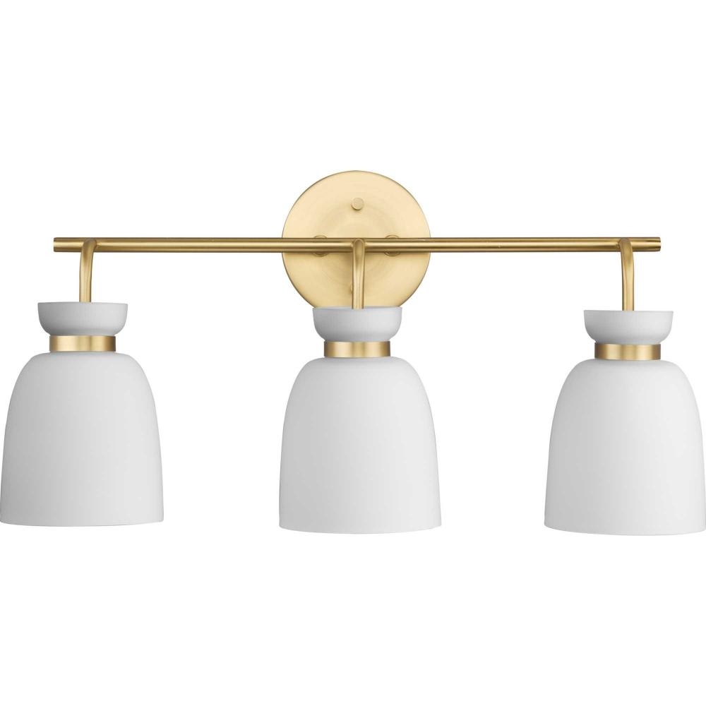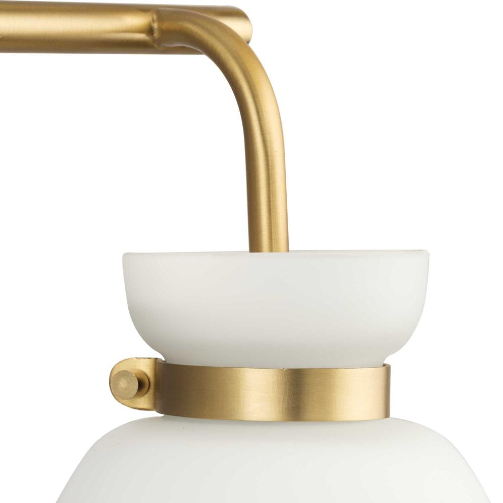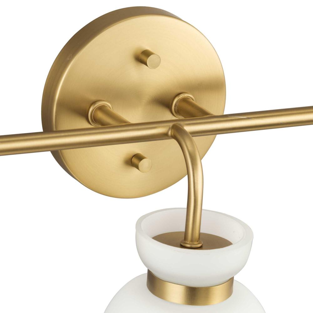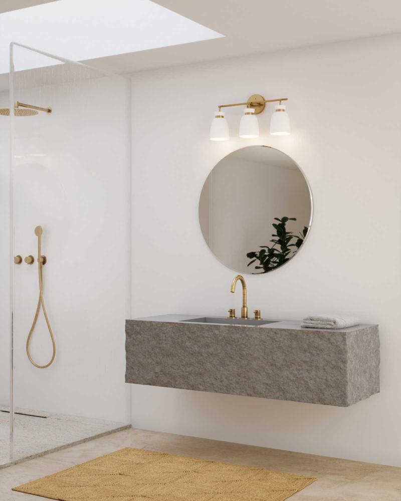 The Lexie Three-Light Vanity Light is full of spunk with a fresh new style for todays home. A slender minimalist frame finished in Brushed Gold supports opal glass shades with a distinctive cinched metallic collar.The versatile fixture can be mounted facing up or down, offering the perfect amount of illumination to the room.