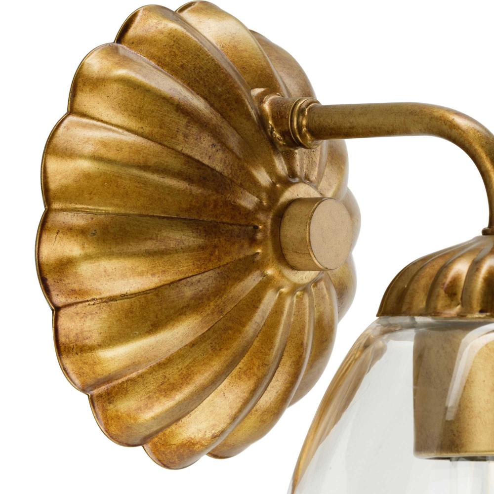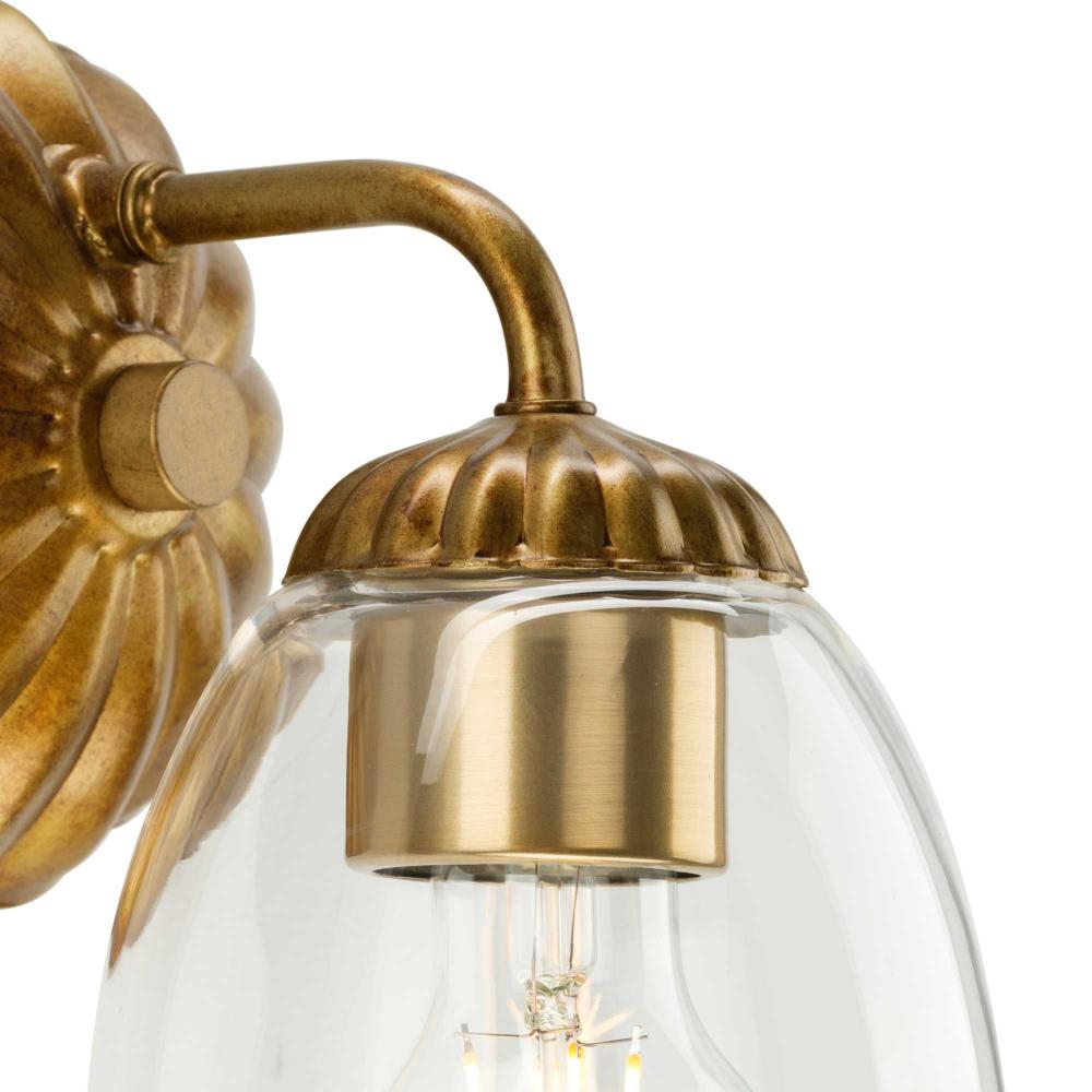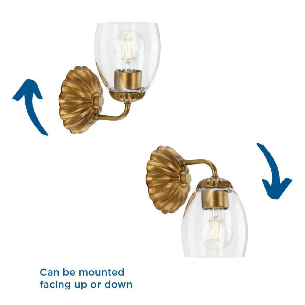 The Quillan One-Light Vanity Light offers a graceful flourish to add distinctive designer touch. Scalloped elements create a richness of detail to complement the clarity of its clear, elliptical glass shade. Each fixture includes both matching and contrasting accent rings. This versatile light can be mounted up or down to provide clear illumination to the room.