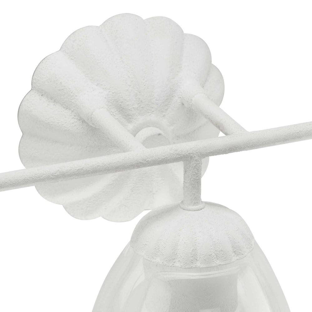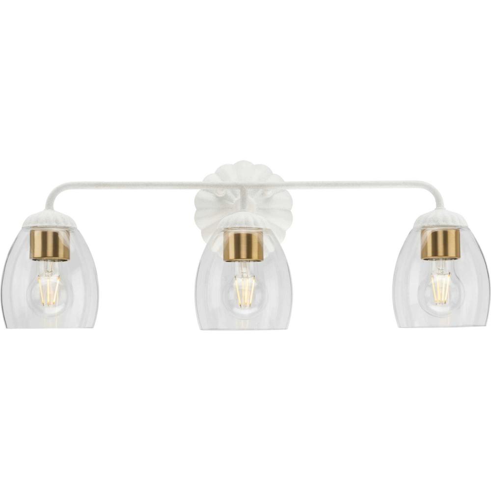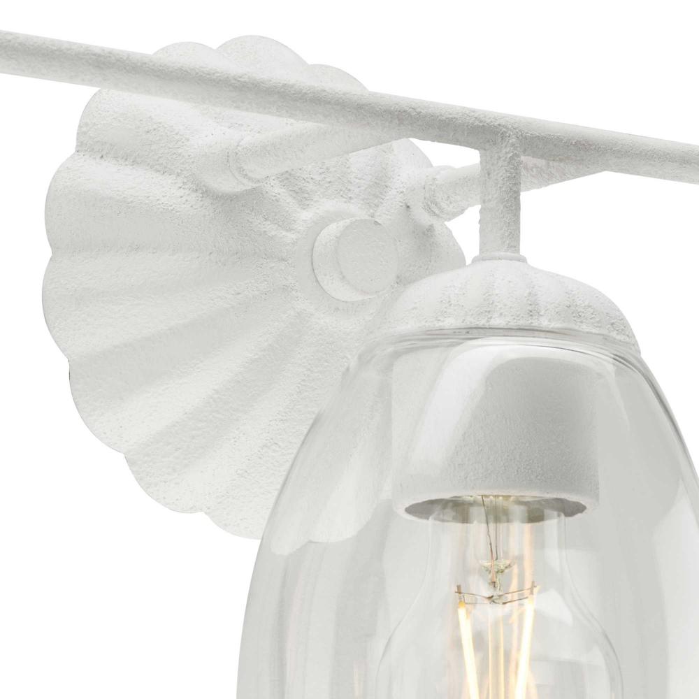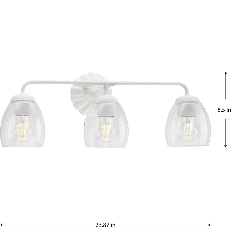 The Quillan Three-Light Vanity Light offers a graceful flourish to add distinctive designer touch. Scalloped elements create a richness of detail to complement the clarity of clear, elliptical glass shades. Each fixture includes both matching and contrasting accent rings. This versatile light can be mounted up or down to provide clear illumination to the room.