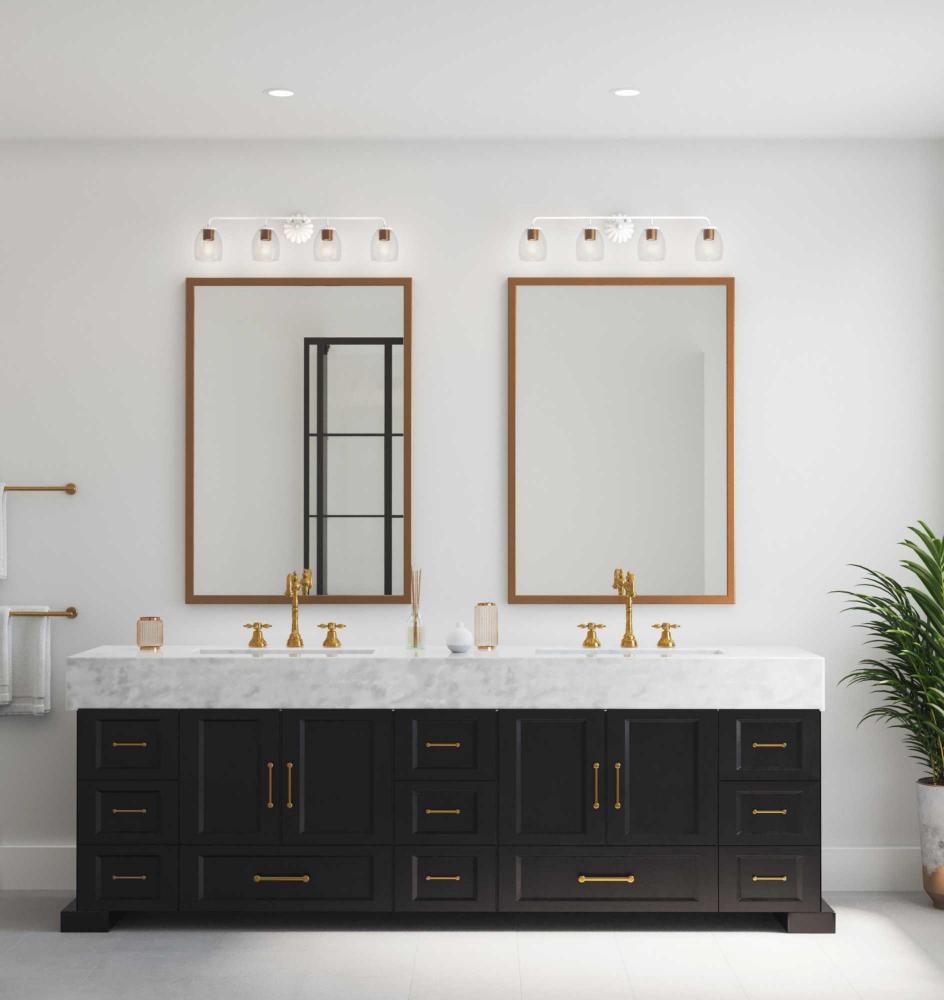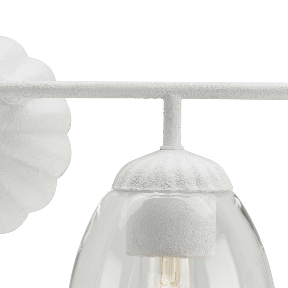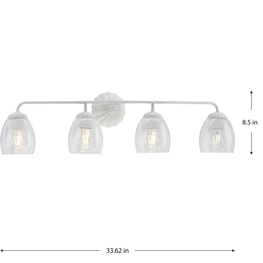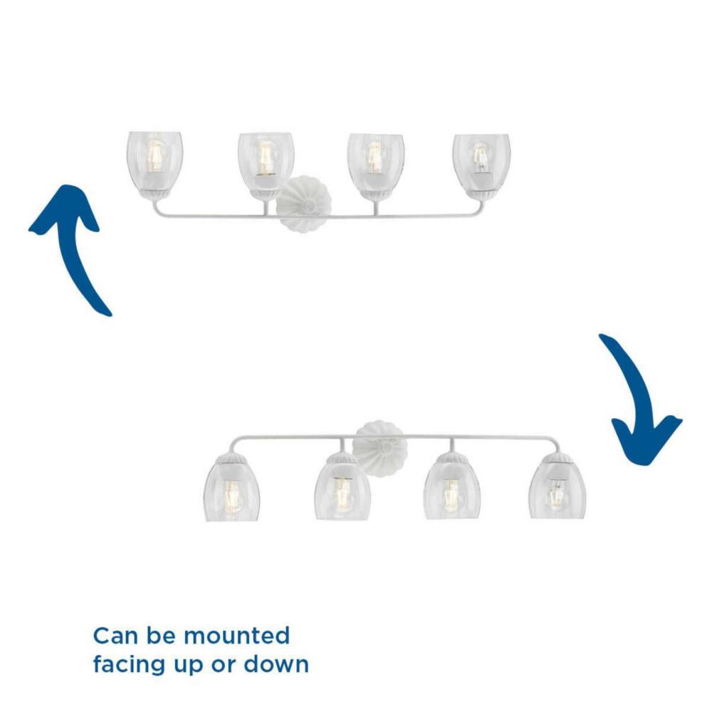The Quillan Four-Light Vanity Light offers a graceful flourish to add distinctive designer touch. Scalloped elements create a richness of detail to complement the clarity of clear, elliptical glass shades. Each fixture includes both matching and contrasting accent rings. This versatile light can be mounted up or down to provide clear illumination to the room.