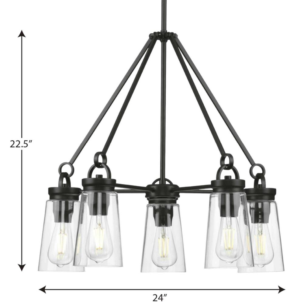 Inspired by traditional post-and-beam construction, the Stockbrace Collection 5-Light Matte Black Clear Glass Farmhouse Chandelier Light. Clean lines, an open design, and architectural details are coated in a classic matte black finish. Light sources illuminate clear glass shades to complete the clean design.