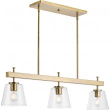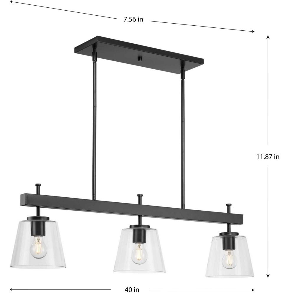 Embrace modern urban style with the Saffert linear chandelier. Clear glass shades punctuate a stoic, beam-style frame. Substantial scale and a bold form make a statement in dining rooms, kitchens and bar areas. Saffert is the perfect choice for new traditional, industrial and luxe interiors.