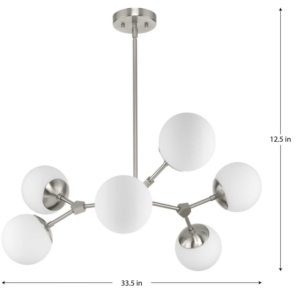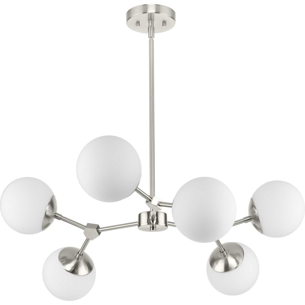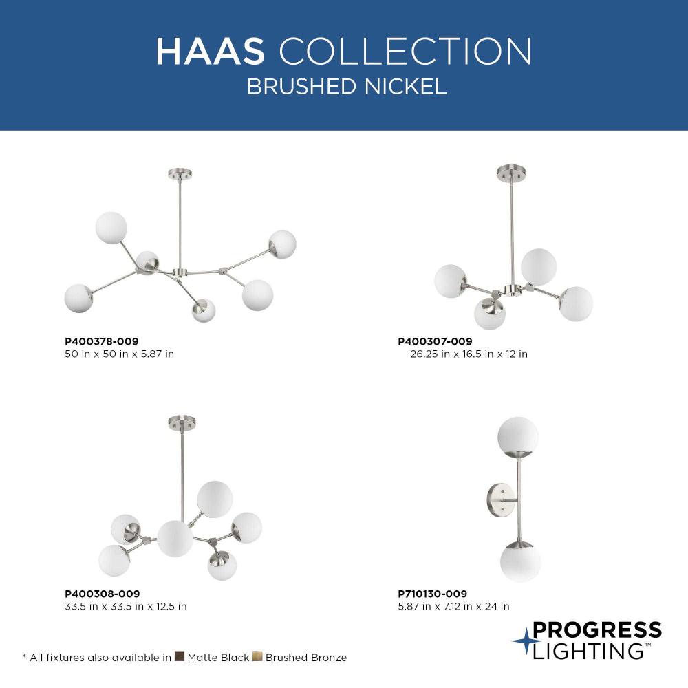 Modern and organic inspirations elegantly meld together in Haas. A bold linear frame branches out to embrace smoothly etched opal glass globes that imbue great rooms, kitchens, and dining rooms with soft illumination, and fits beautifully into mid-century modern and contemporary settings. This fixture is part of the Progress Lighting Design Series, a lighting collection offering fashionable styles and affordable luxury lighting for the home.