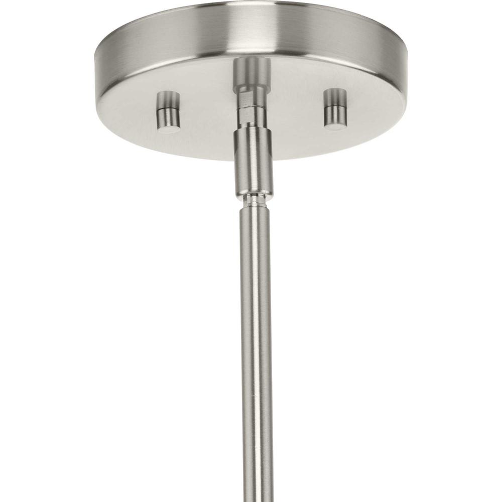 The light is coated with a subtle brushed nickel finish, ideal for mid-century modern settings