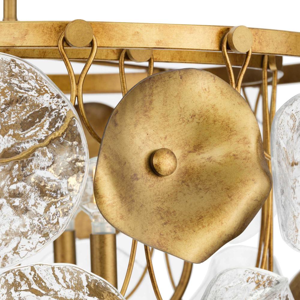 The Loretta Collection captures the serene feel of lily pads floating in a gently rippling pond. Glimmering artisanal clear glass is paired with handcrafted metal leaves finished in a soft, Gold Ombre patina.Light sources deliver an ambient glow behind the luxe glass and metallic discs that festoon its graceful frame. This fixture is part of the Progress Lighting Design Series, a lighting collection offering fashionable styles and affordable luxury lighting for the home.