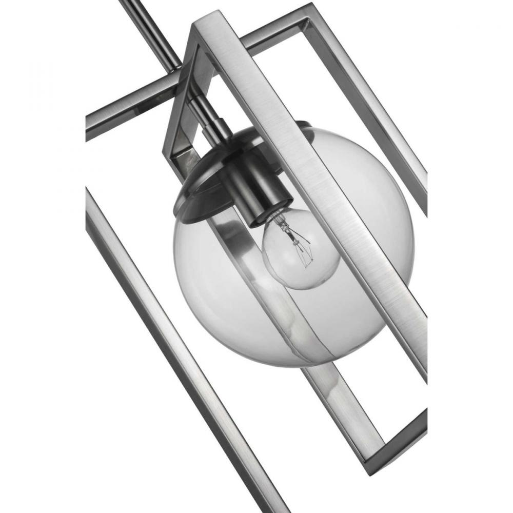 Extraordinary on the first impression, but always at peace with whatever setting it calls home, this pendant is a statement-making lighting design.;A clear globe shade softens and contrasts with the frame's sharp corners.;The light fixture features an