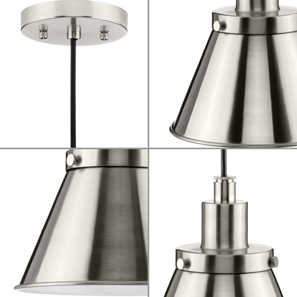 The pendant's metal fittings and cone shaped metal shade creates a stately accent to modern themes