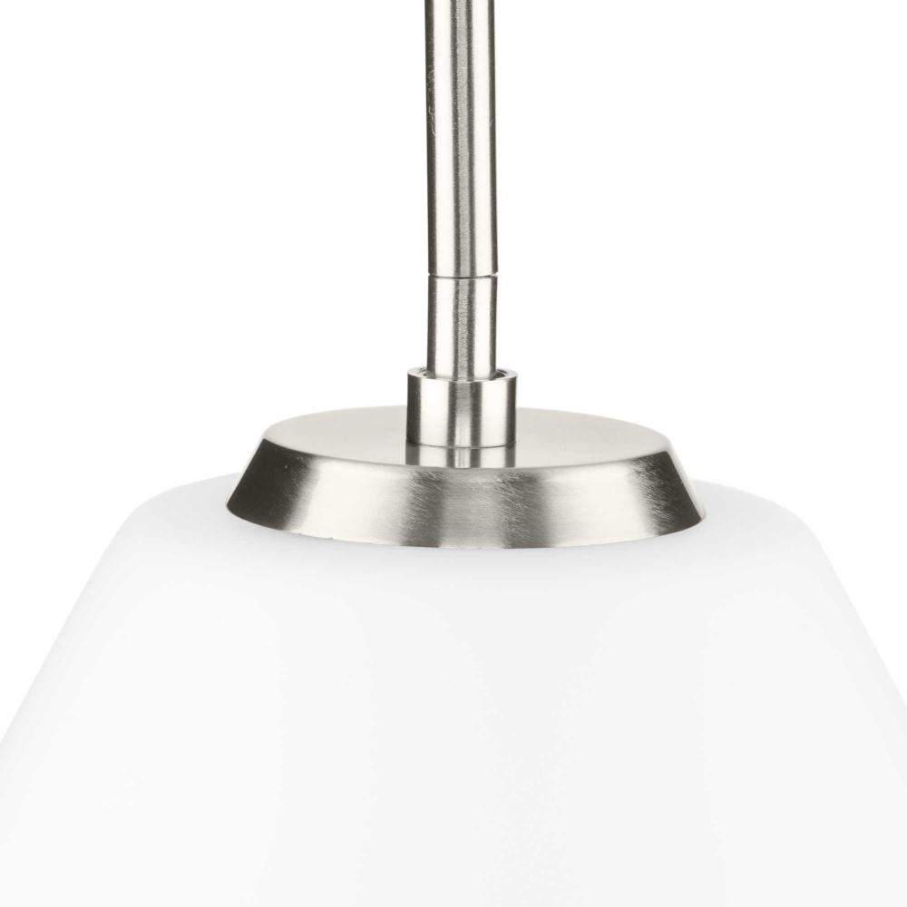 The fixture is coated with a subtle brushed nickel finish, accenting mid-century modern settings with elegance