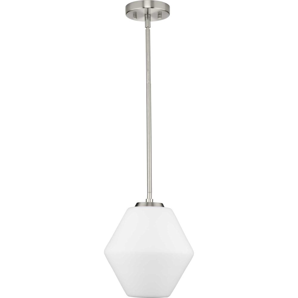A softened diamond silhouette brings modern appeal to the Copeland pendant light. The geometric opal glass shade is fully enclosed, concealing the light source to deliver elegant illumination to mid-century modern and contemporary settings.