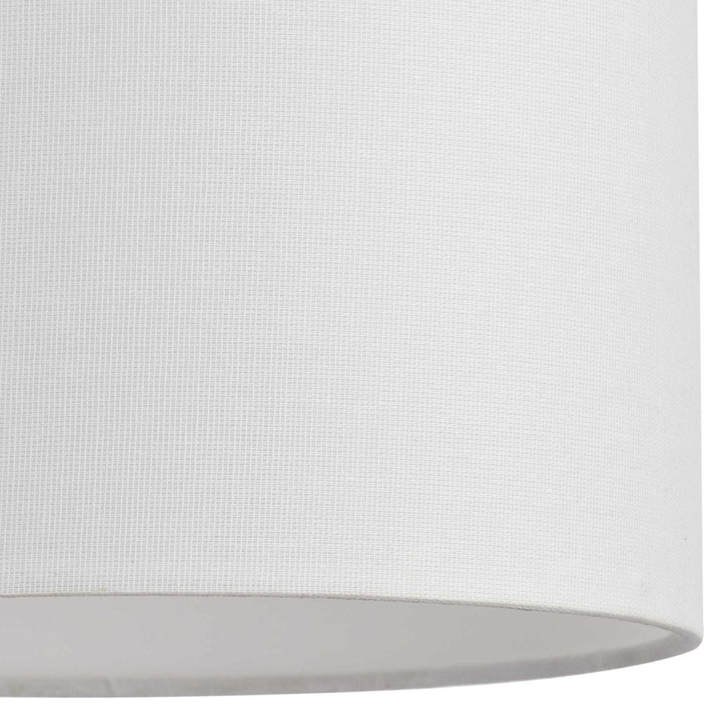 A white linen shade offers a modern touch to the light's contemporary form