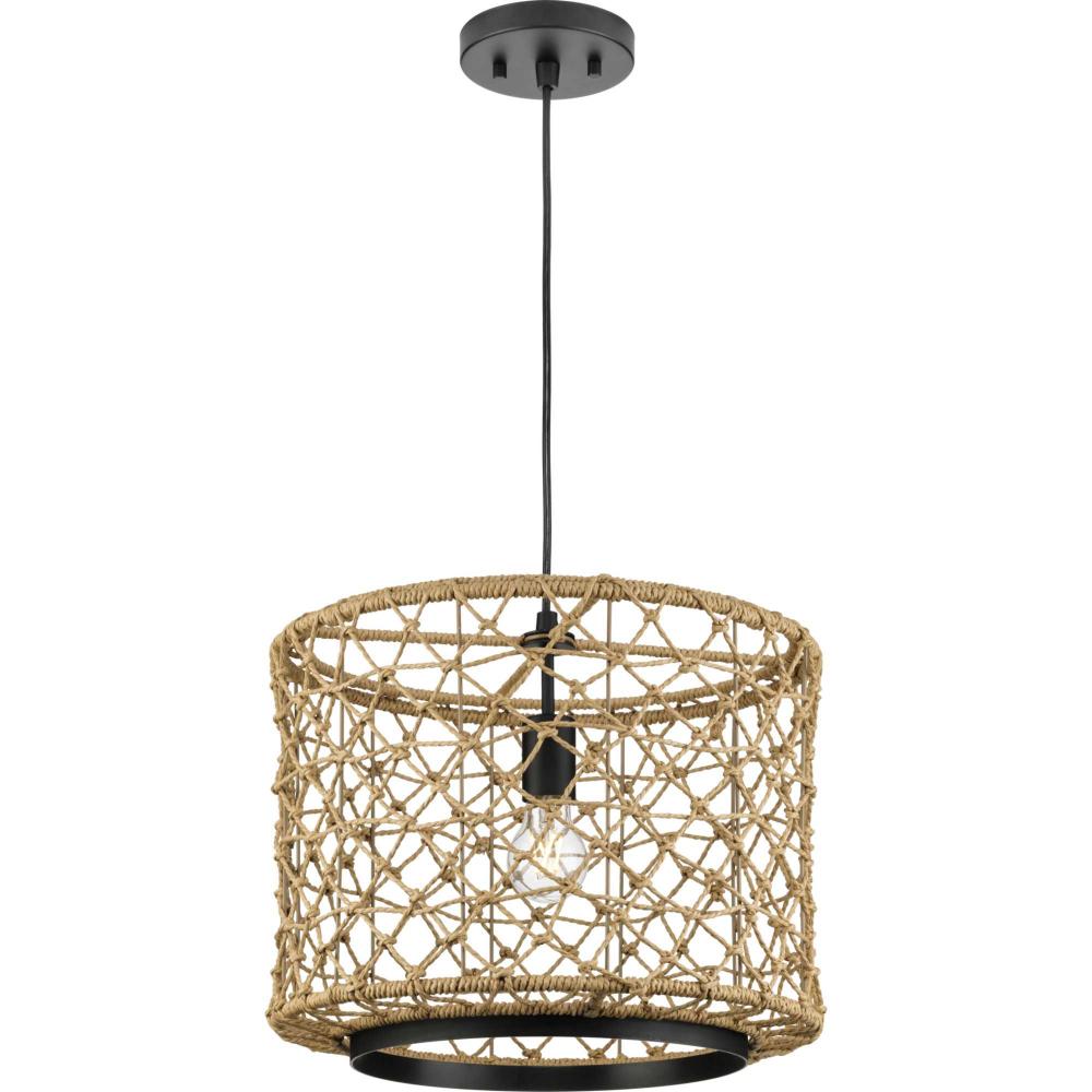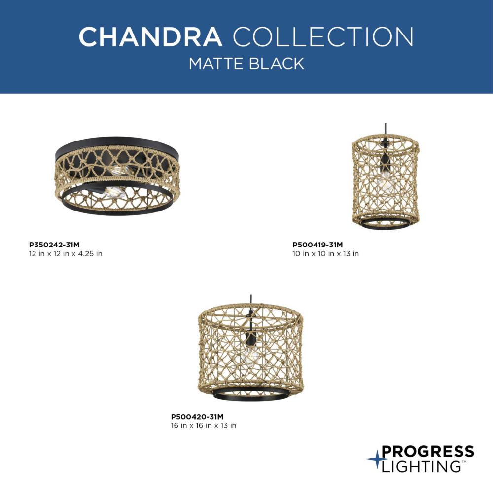 Chandra is handwoven by artisans into a casual, artful lantern form. This beautiful luminaire's organic style complements global, coastal and transitional settings. Knotted string in an open airy pattern filters light beautifully to provide relaxed warmth and texture to kitchens, breakfast nooks and bedrooms. This fixture is part of the Progress Lighting Design Series, a lighting collection offering fashionable styles and affordable luxury lighting for the home.
