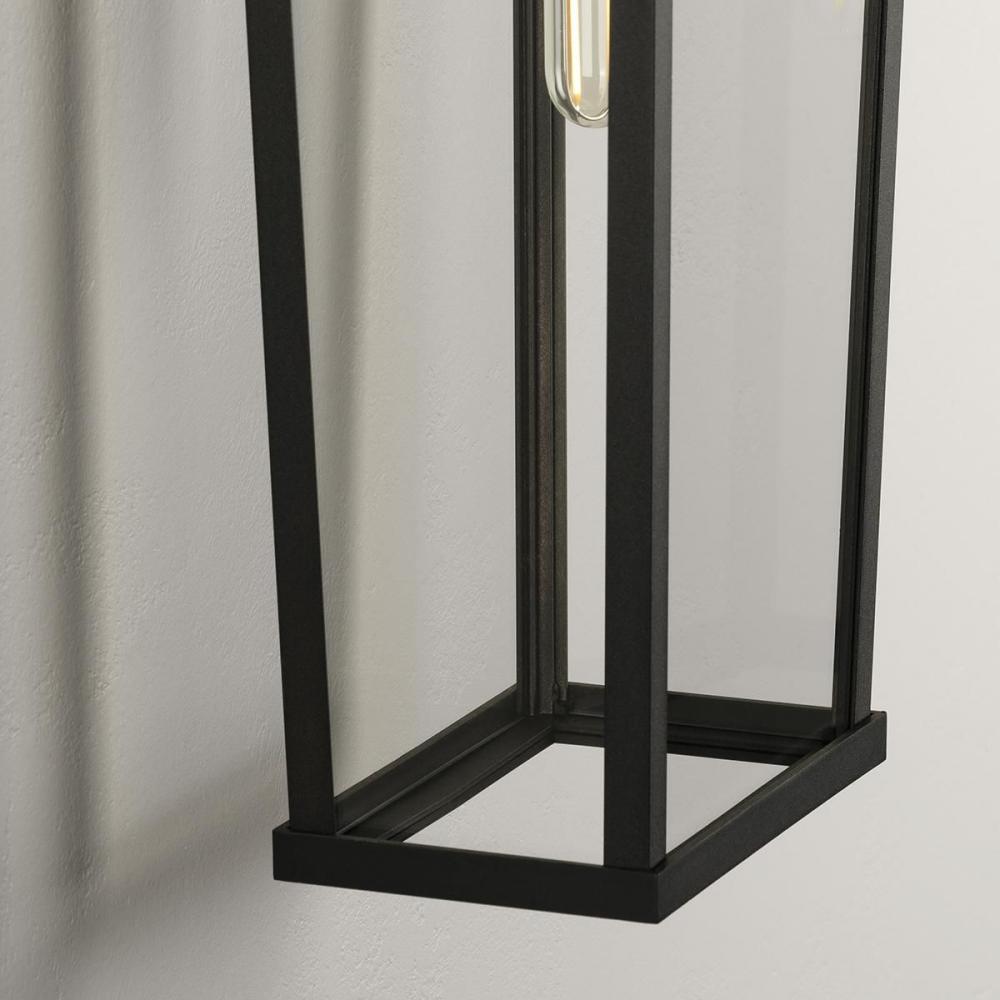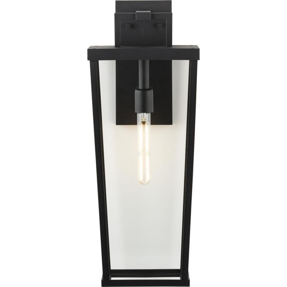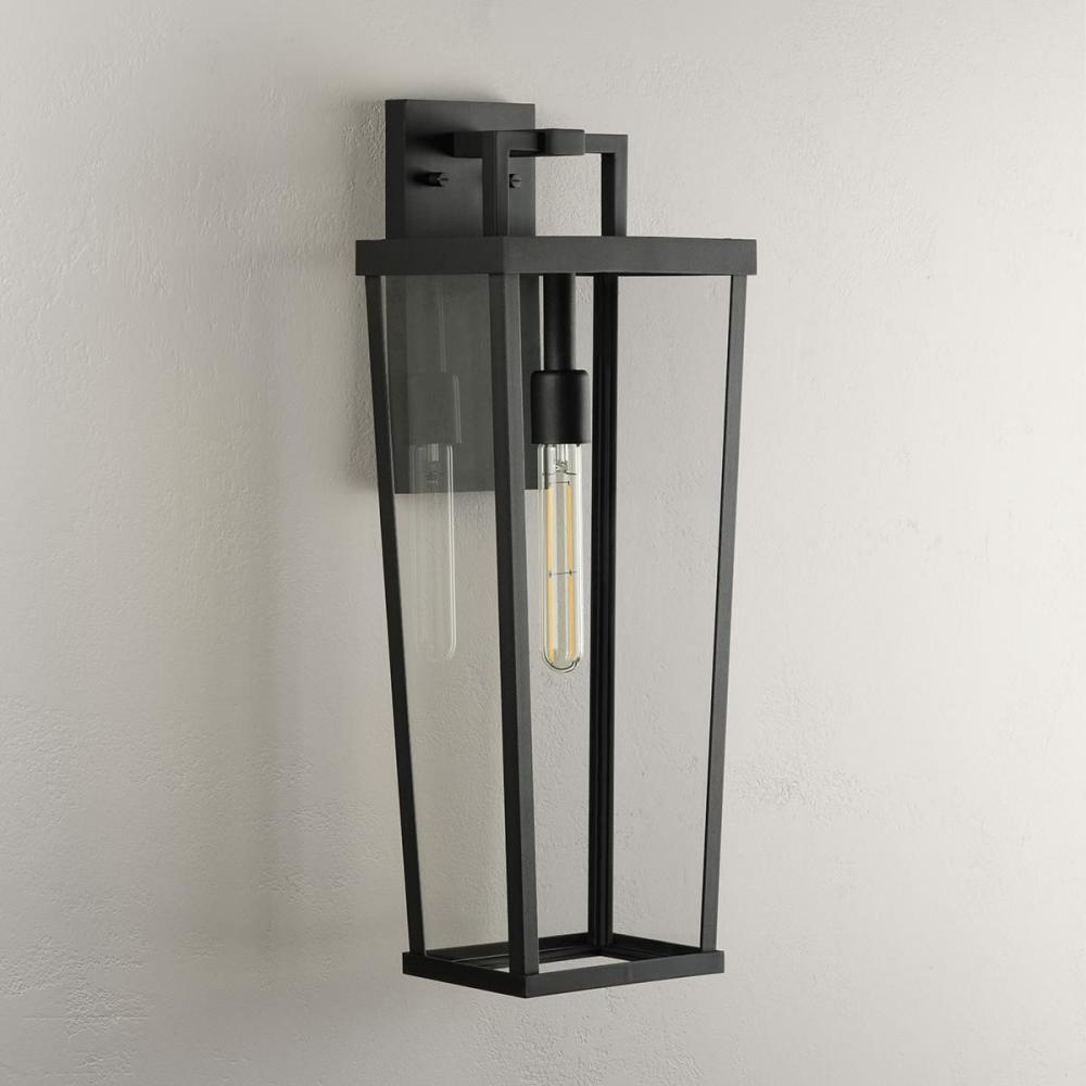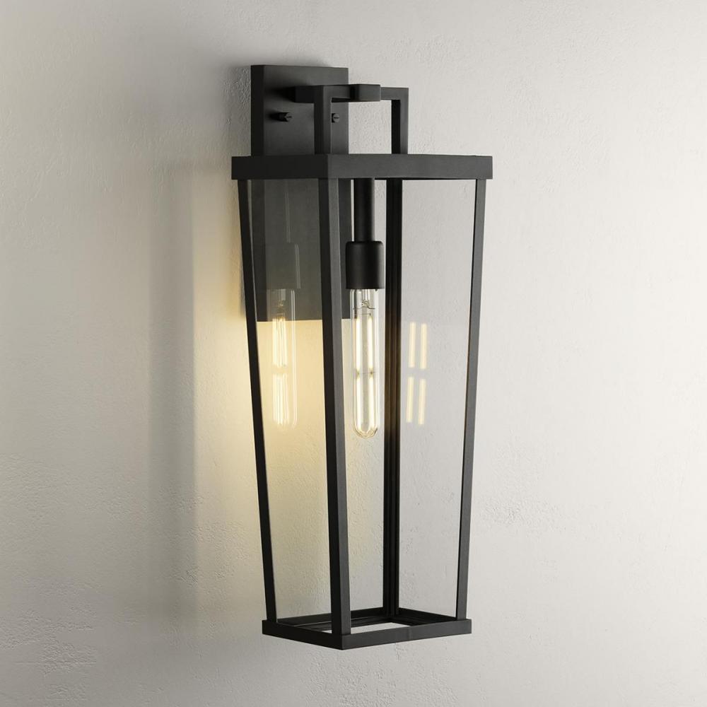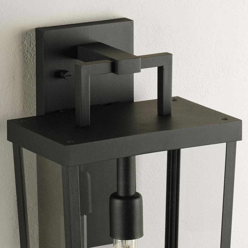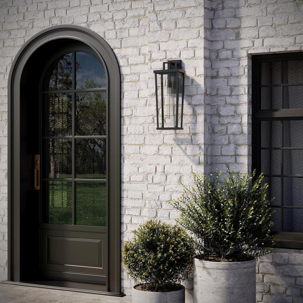 The Tryon Outdoor Wall Lantern features an elongated, tapered geometric frame finished in classic black that exudes refined simplicity. A sleek, squared arch connects the minimalist frame to the backplate while clear glass panels beautifully showcase a sin