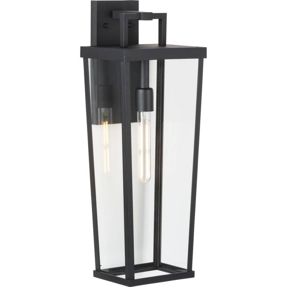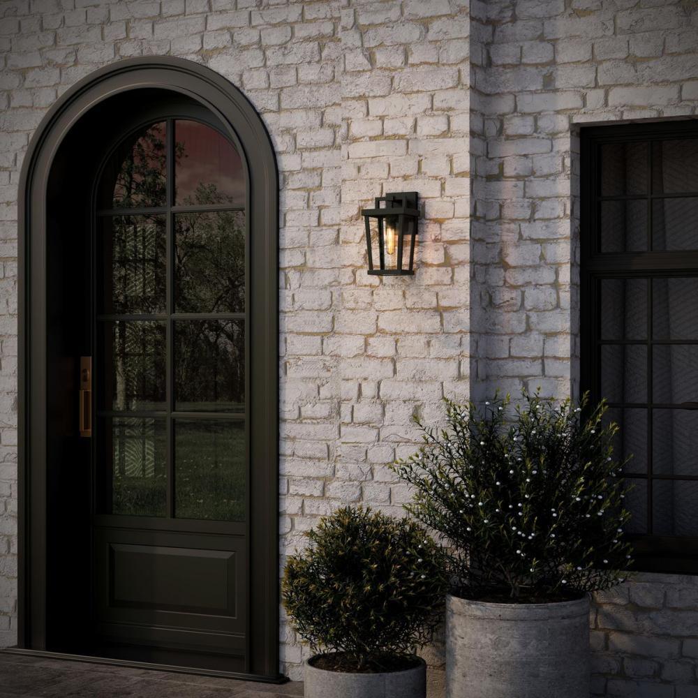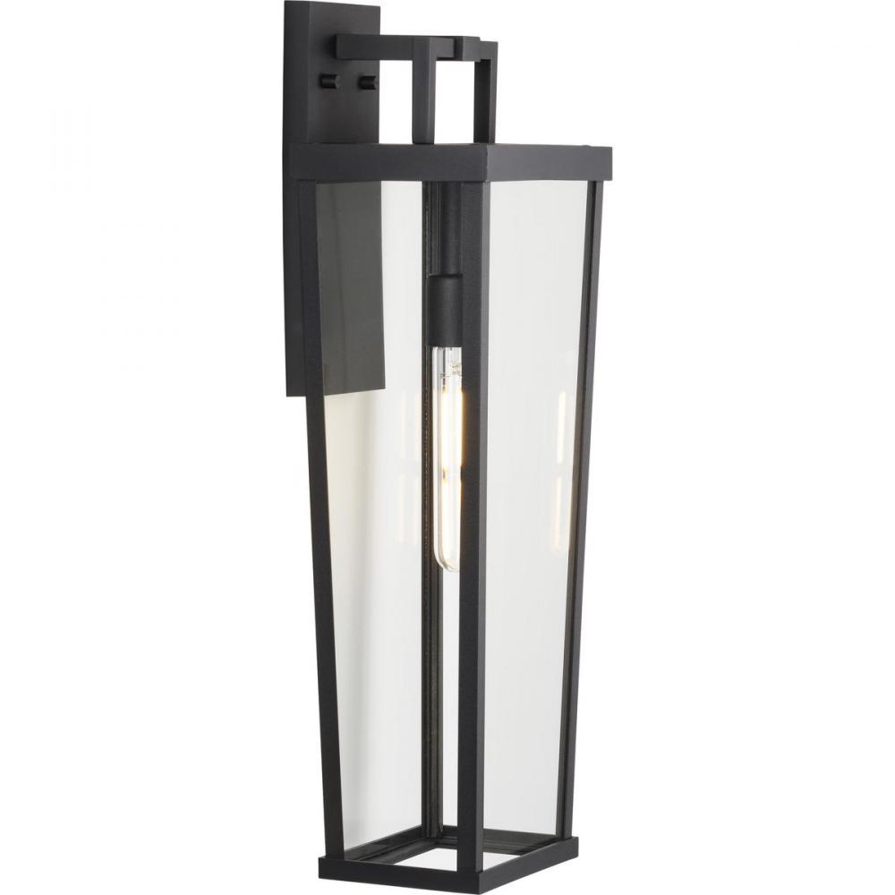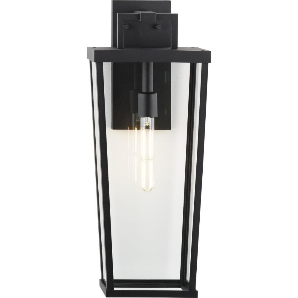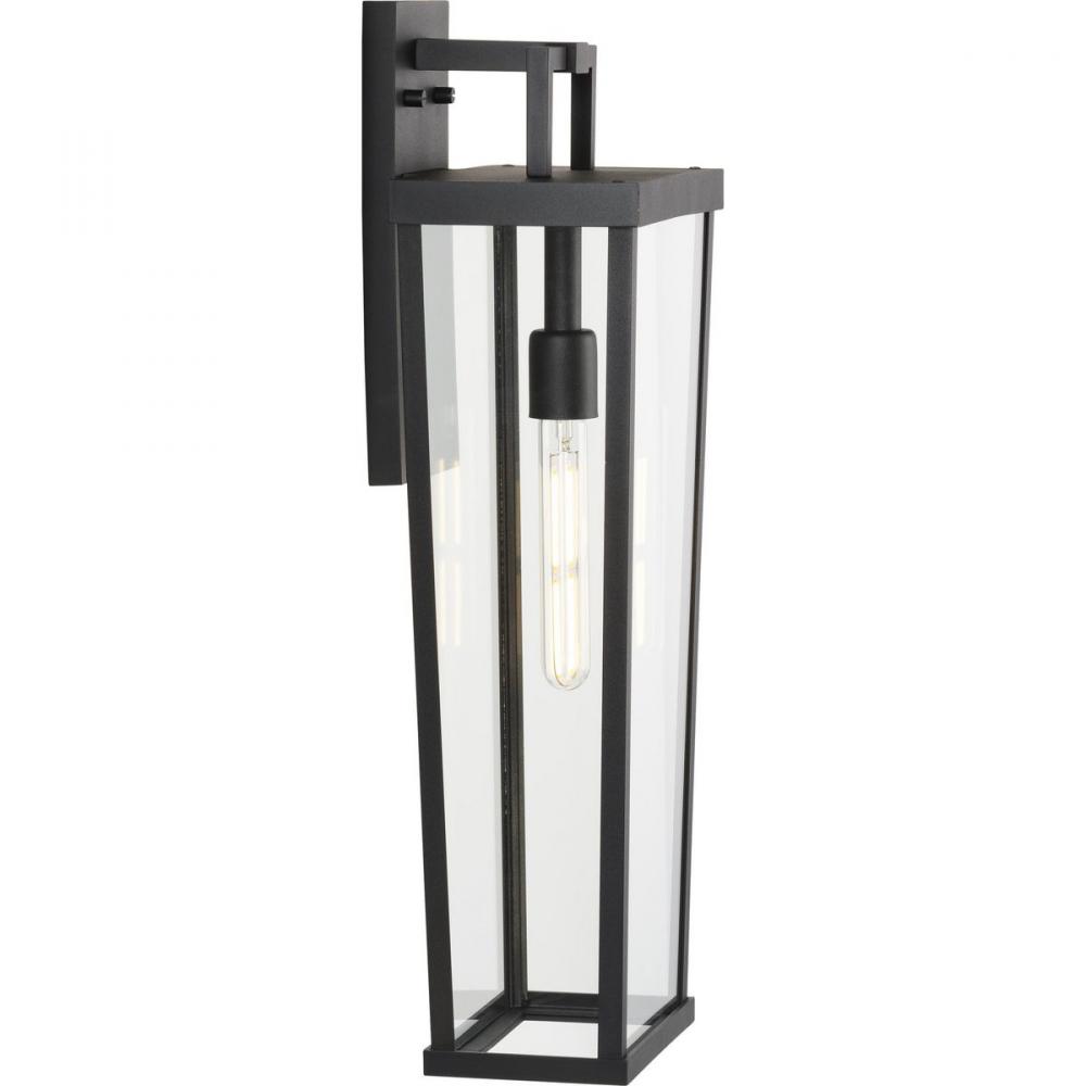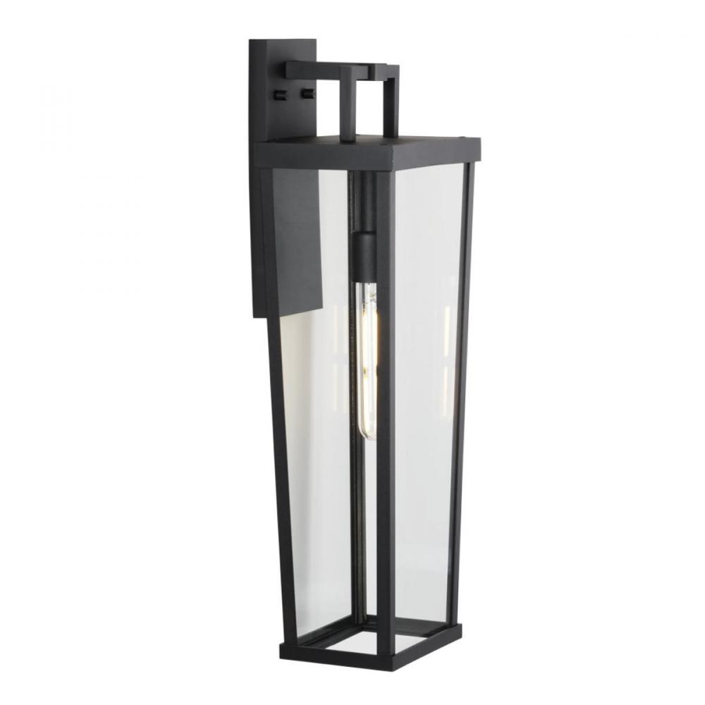 The Tryon Outdoor Wall Lantern features an elongated, tapered geometric frame finished in classic black that exudes refined simplicity. A sleek, squared arch connects the minimalist frame to the backplate while clear glass panels beautifully showcase a sin