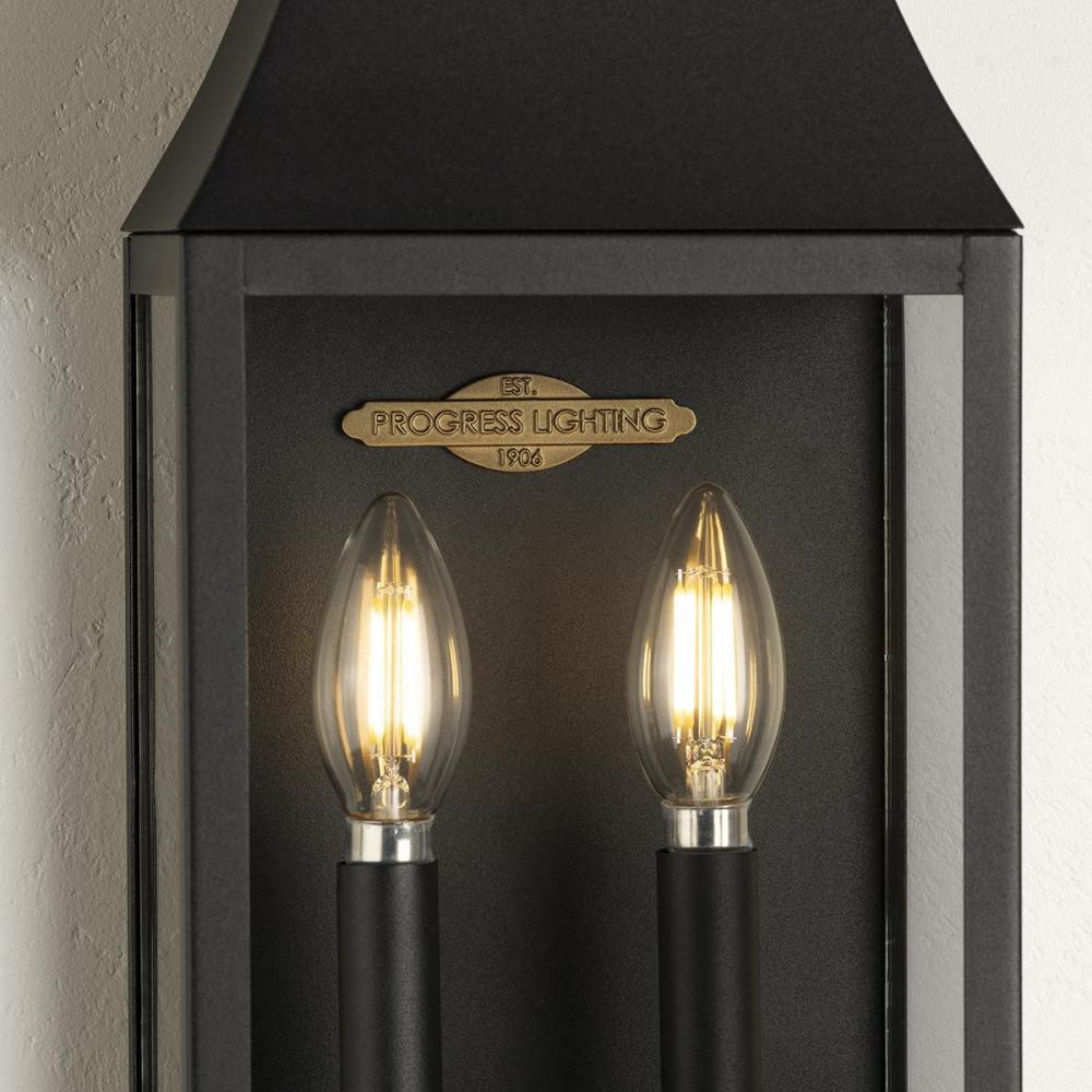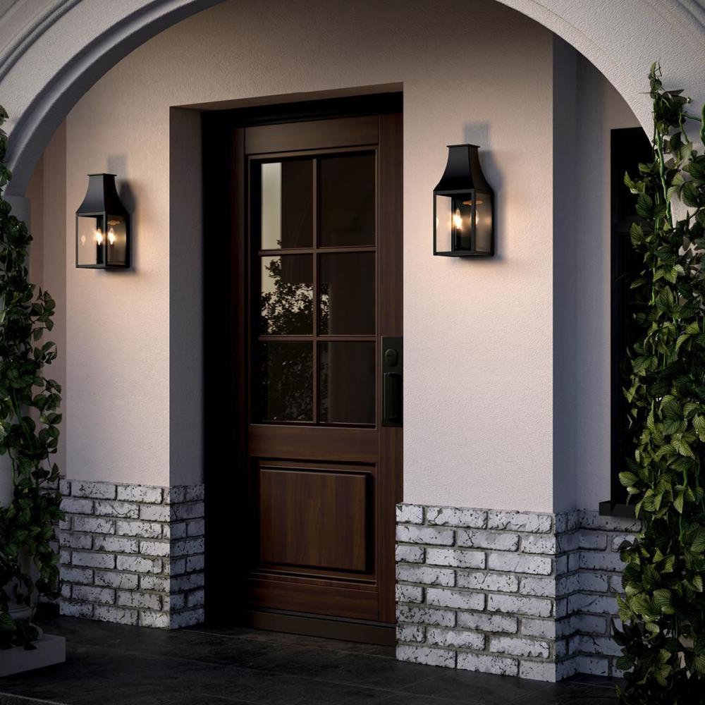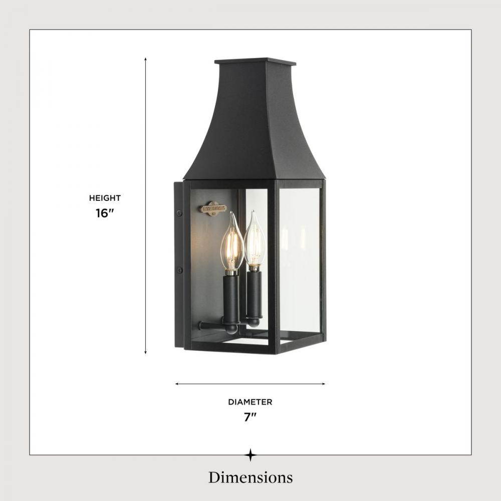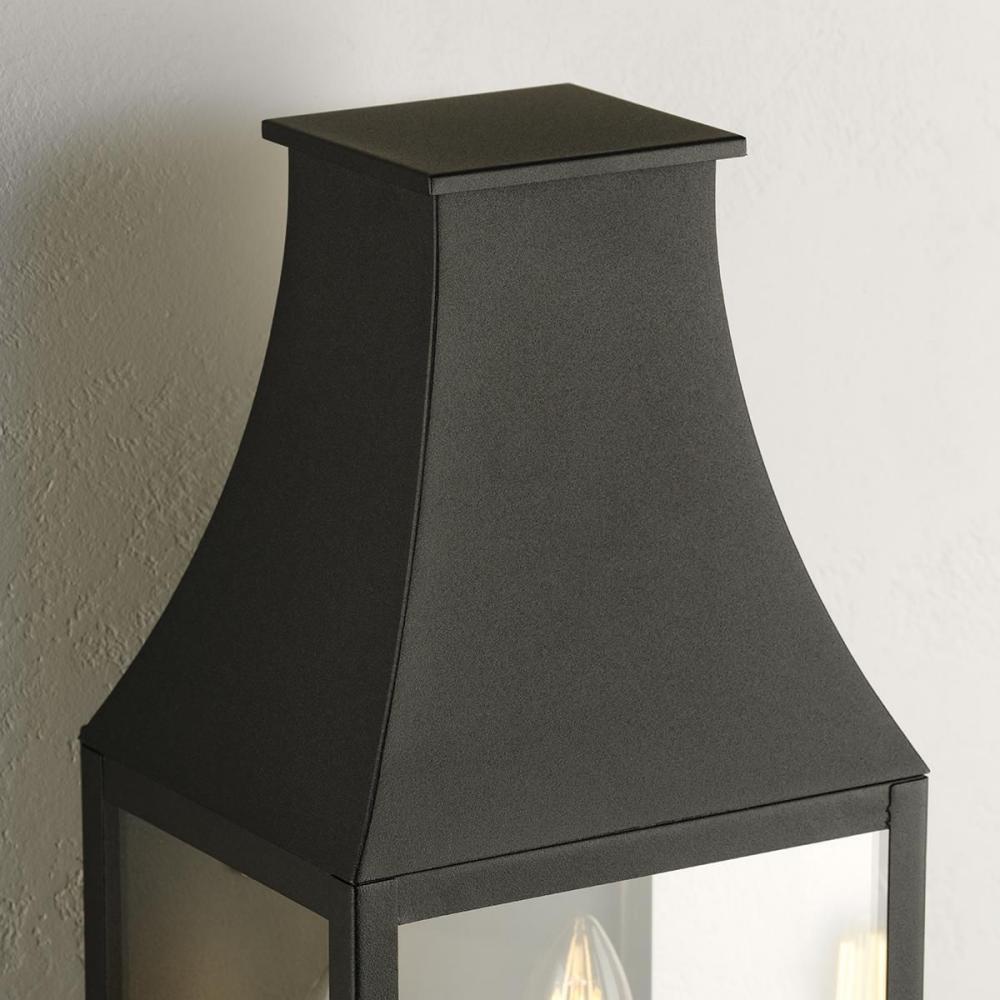 The Radcliffe Outdoor Wall Lantern offers a touch of old-world charm with its traditional mansard roof design. Inside, two candelabra lamps cast a warm glow softened by the clear glass panes that encase the black frame. A small plaque within the frame prou