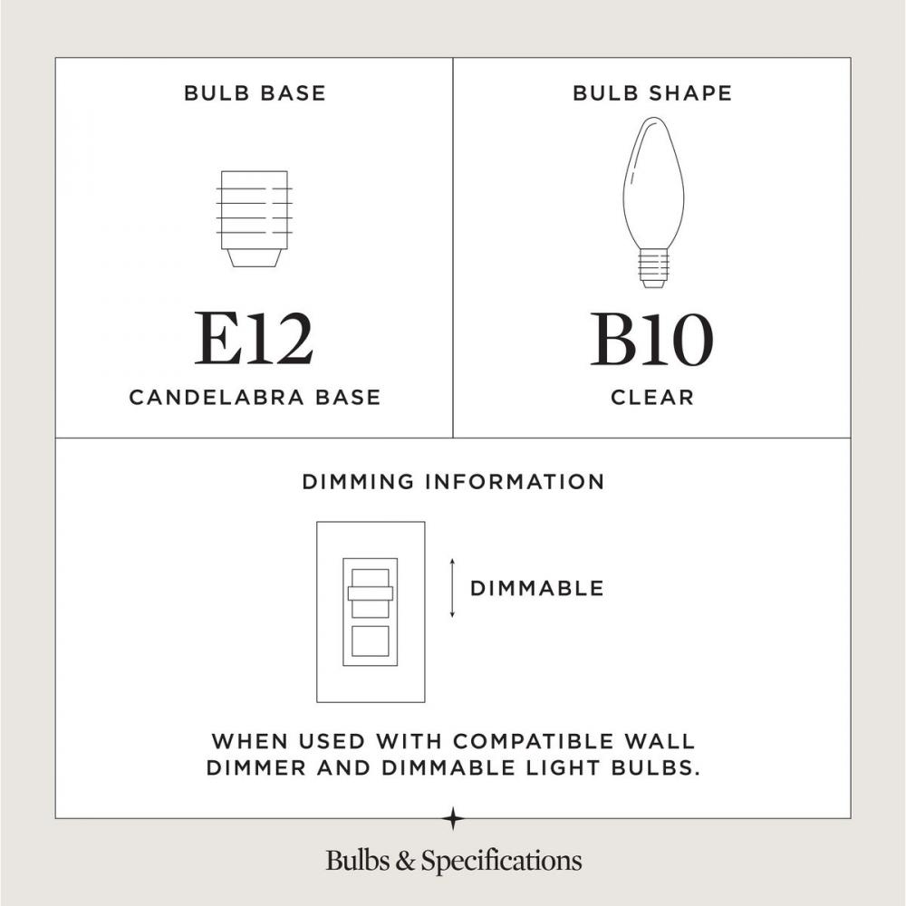 Uses (2) 60-watt max candelabra base bulbs or LED equivalent, that are sold separately, and dimmable when used in conjunction with a dimmable bulb