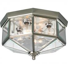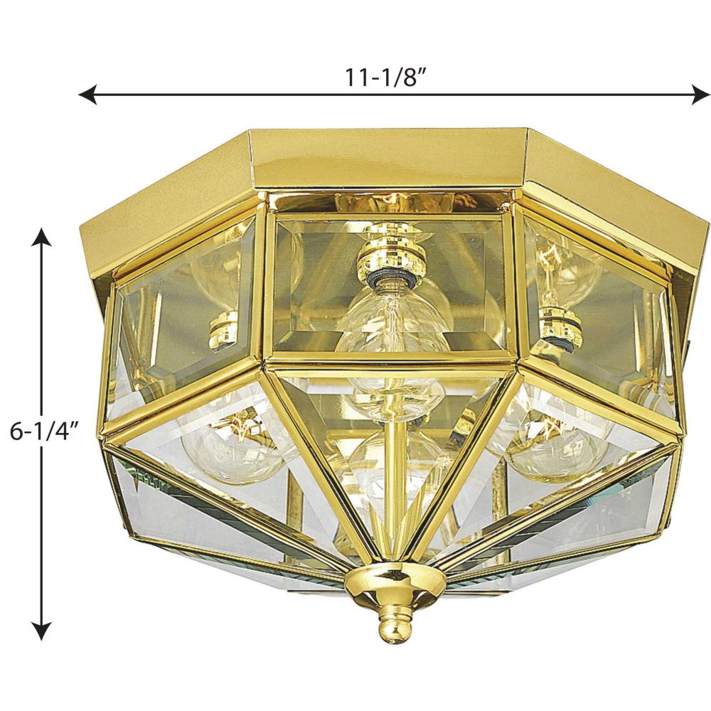 Four-light octagonal close-to-ceiling fixture with clear, bound beveled glass. Solid brass construction. G-lamps recommended. Traditional styling perfect for halls, closets, porches, laundry rooms, bedroom. Polished Brass finish.