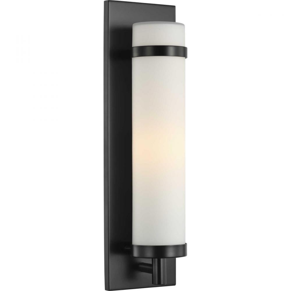 Ease yourself into a state of complete bliss and relaxation under the luxurious glow of this wall sconce. A stunning, cylinder-shaped etched opal glass diffuser held in place by a thin metal bar recalls visions of elegant candlesticks. The diffuser sits on top of a pedestal-like light base attached to a beautiful black backplate.