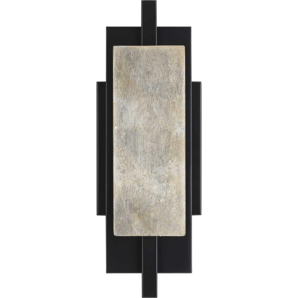 The light is coated with a soft matte black finish, emphasizing the distressed silver leaf panels that accent the fixture's frame