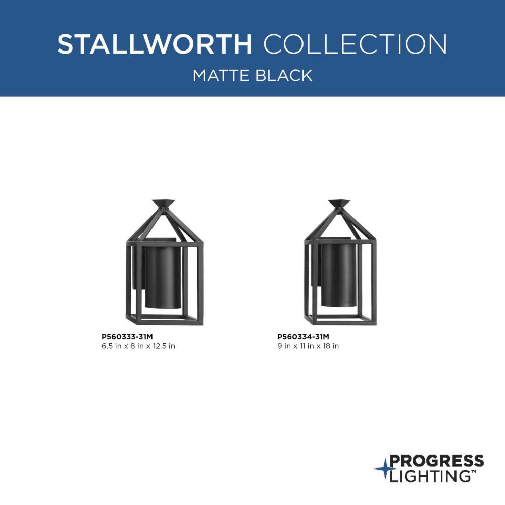 Establish a bold statement with the modern Stallworth Collection, whose minimalistic design offers maximum visual interest for contemporary and modern craftsman exteriors. The light's open framework finished in crisp matte black is a contemporary take on classic lantern styling with angular lines. A cylindrical metal shade projects a wash of warm downlight from this Dark Sky friendly wall lantern, making it perfect porches, patios and other outdoor spaces. It is cULus wet location listed for use where water may be present, with a one-year warranty to guarantee your complete satisfaction. Progress Lighting products are designed for exceptional quality, reliability, and functionality.
