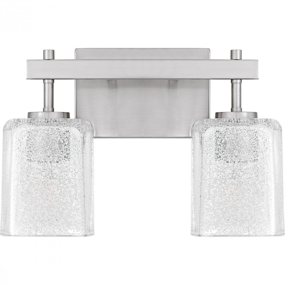 The Brenthouse bath light features a clean, minimalist design with a striking visual impact. Square glass shades cast a soft, diffused glow while adding a touch of texture to the simple silhouette. The thick glass shades feature tiny crystals on the inside
