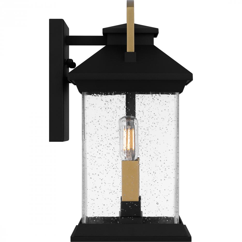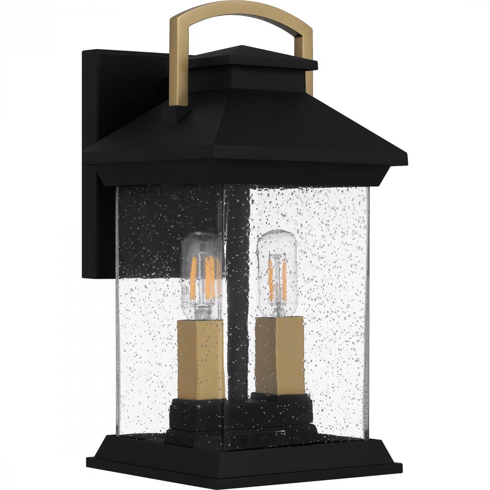 Adorn your homes exterior with Henderson outdoor wall lanterns. The rectangular silhouette is finished in earth black and features gold accents for an extra hint of modern style and luxury. Clear seedy glass shades add sparkle to the overall design, making