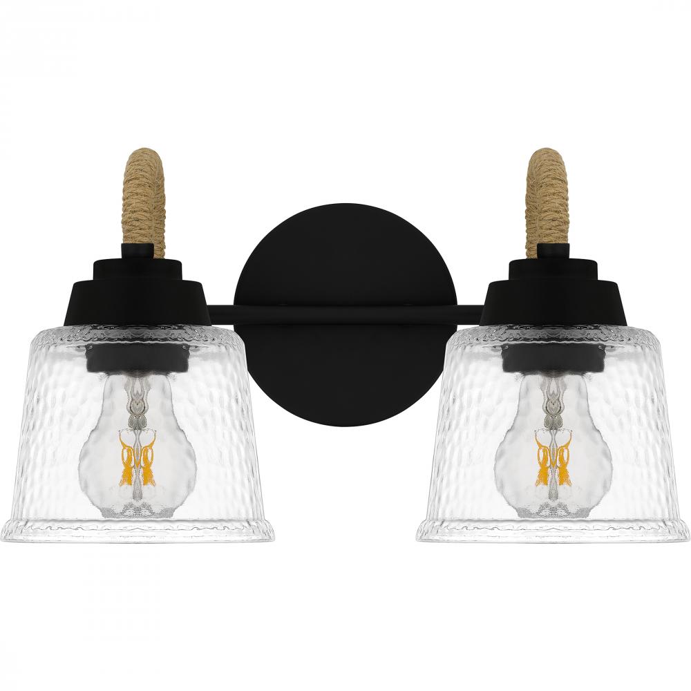 Upgrade any bathroom vanity with the addition of Seabreeze. This coastal-inspired bath light collection features clear hammered glass shades and a matte black finish. A natural looking arm takes the place of traditional metal, adding a nautical feel. Insta