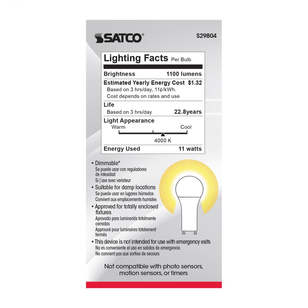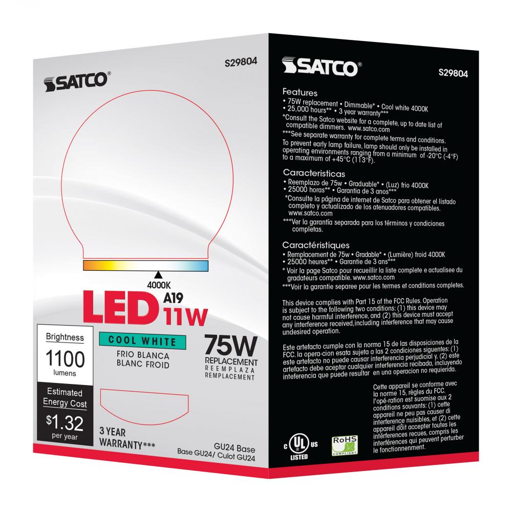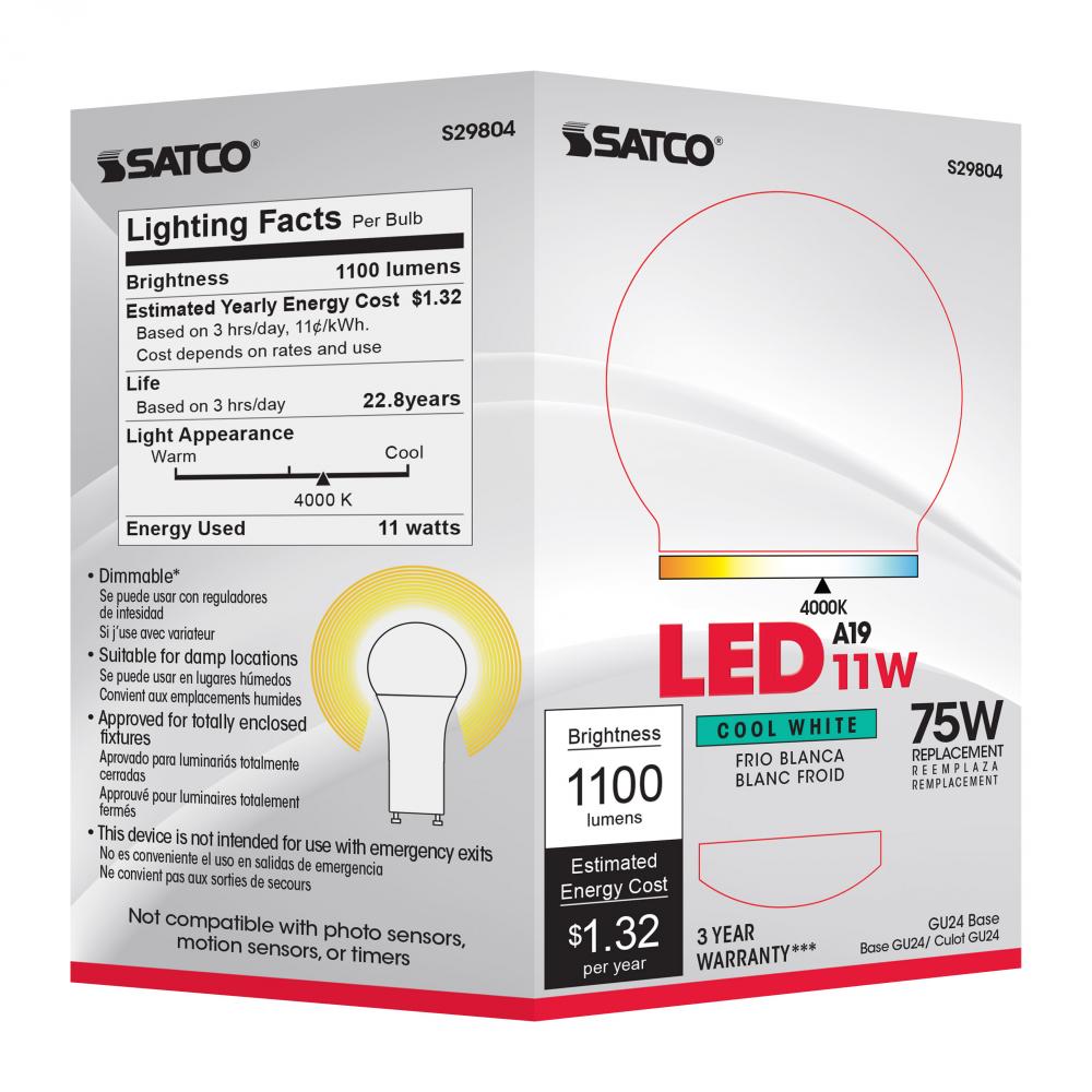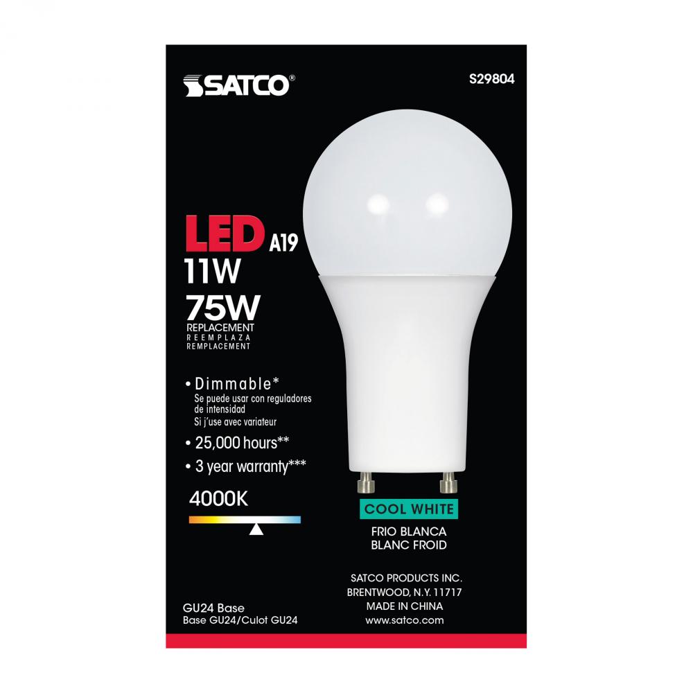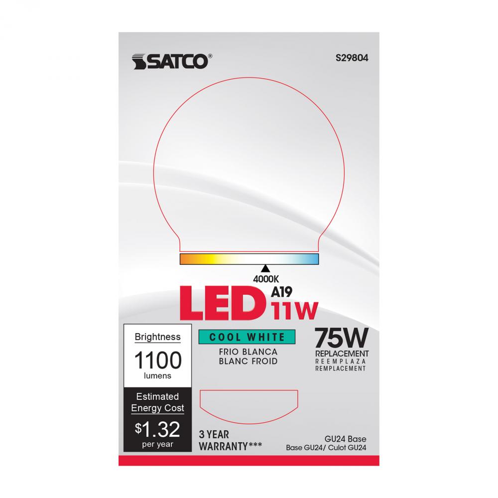 11 Watt; A19 LED; 4000K; GU24 base; 220 deg. Beam Angle; 120 Volt