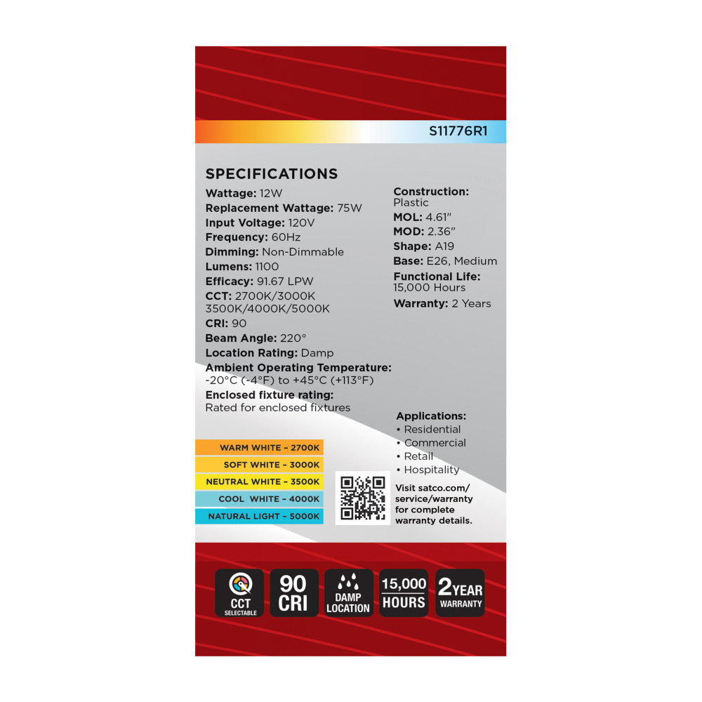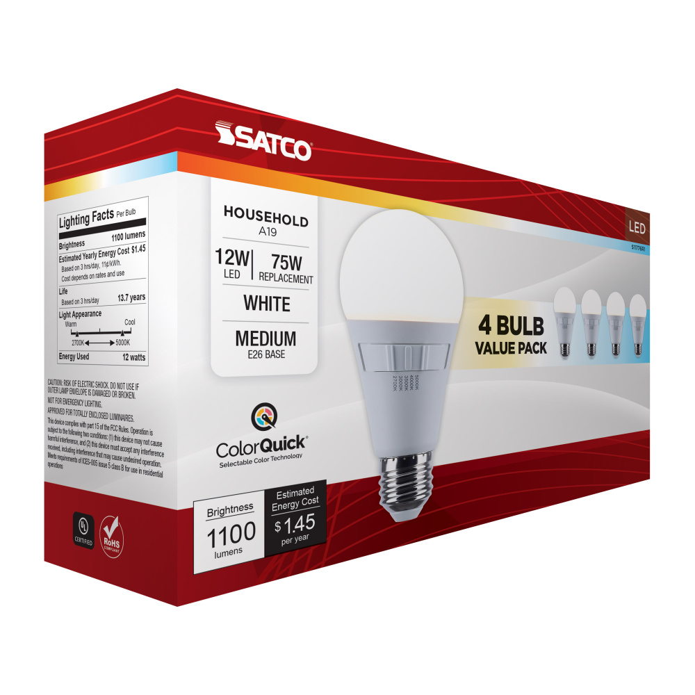 Elevate your everyday lighting with SATCO NUVO's S11776R1 12W LED A19 bulb-designed for flexibility, clarity, and dependable performance. Sold in a convenient, money-saving 4-pack, this bulb offers 5 CCT selectable options from a cozy 2700K to a vibran