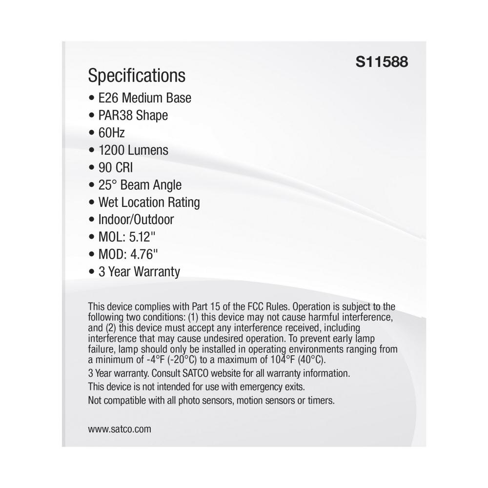 SATCO NUVO's LED S11588 PAR Lamp is the perfect solution for recessed and flood lighting. The PAR38 25 degree beam angle offers the best illumination for your application. Features a unique dial for the choice between 2700K/3000K/3500K/4000K/5000K colo