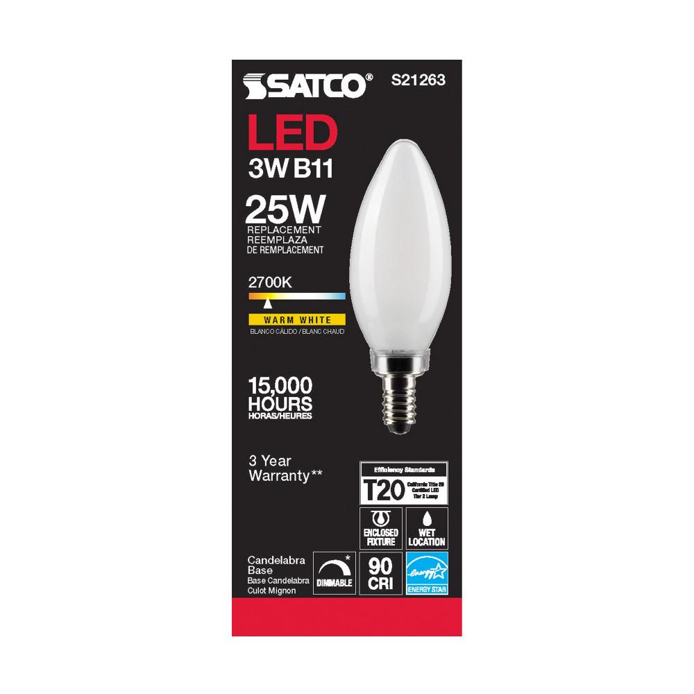 Satco's S21263 3-watt LED lamp is traditional, yet contemporary with its sleek finish and energy saving LED technology. Elegantly illuminate any room in the house with this dimmable, frost finished bulb. Sophisticated and modern, this lamp delivers 15,