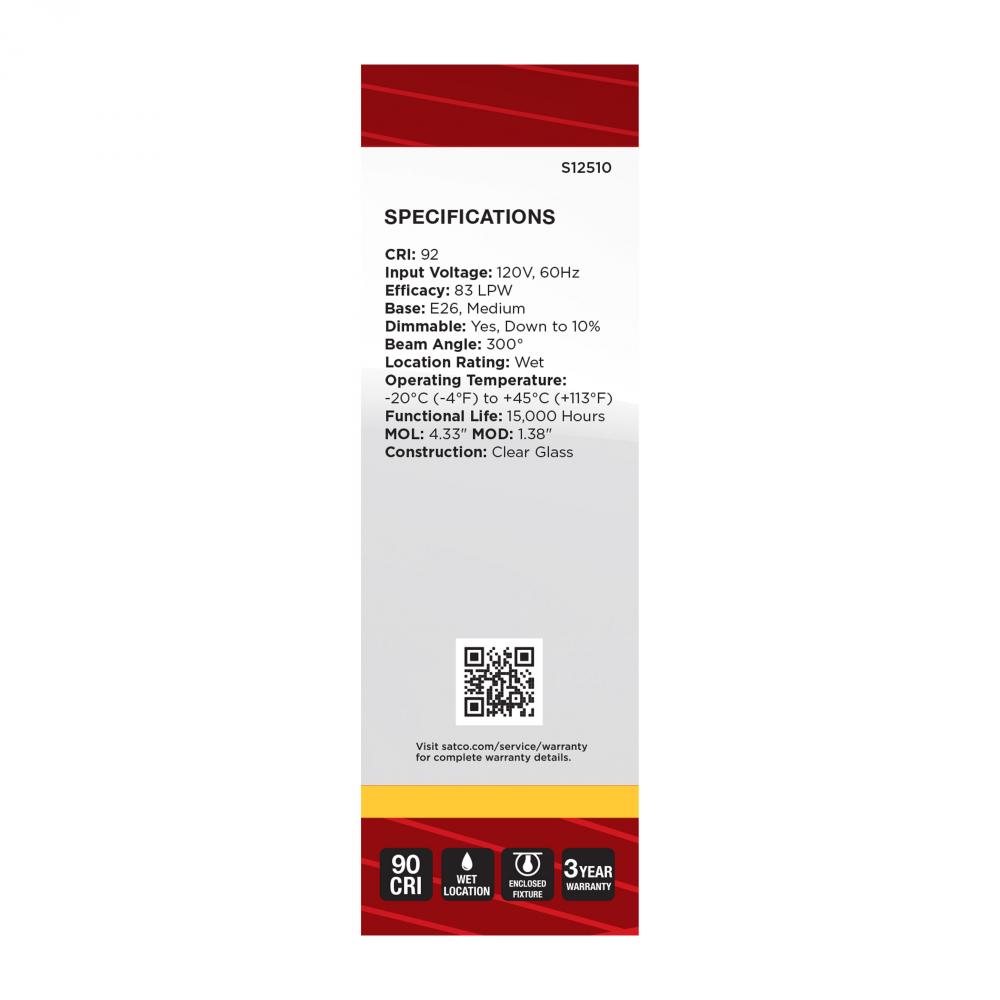 Satco's S12510 3-watt LED lamp is traditional, yet contemporary with its vintage style and energy saving LED technology. Elegantly illuminate any room in the house with this dimmable, clear bulb. Sophisticated and modern, this lamp delivers 15,000 hour