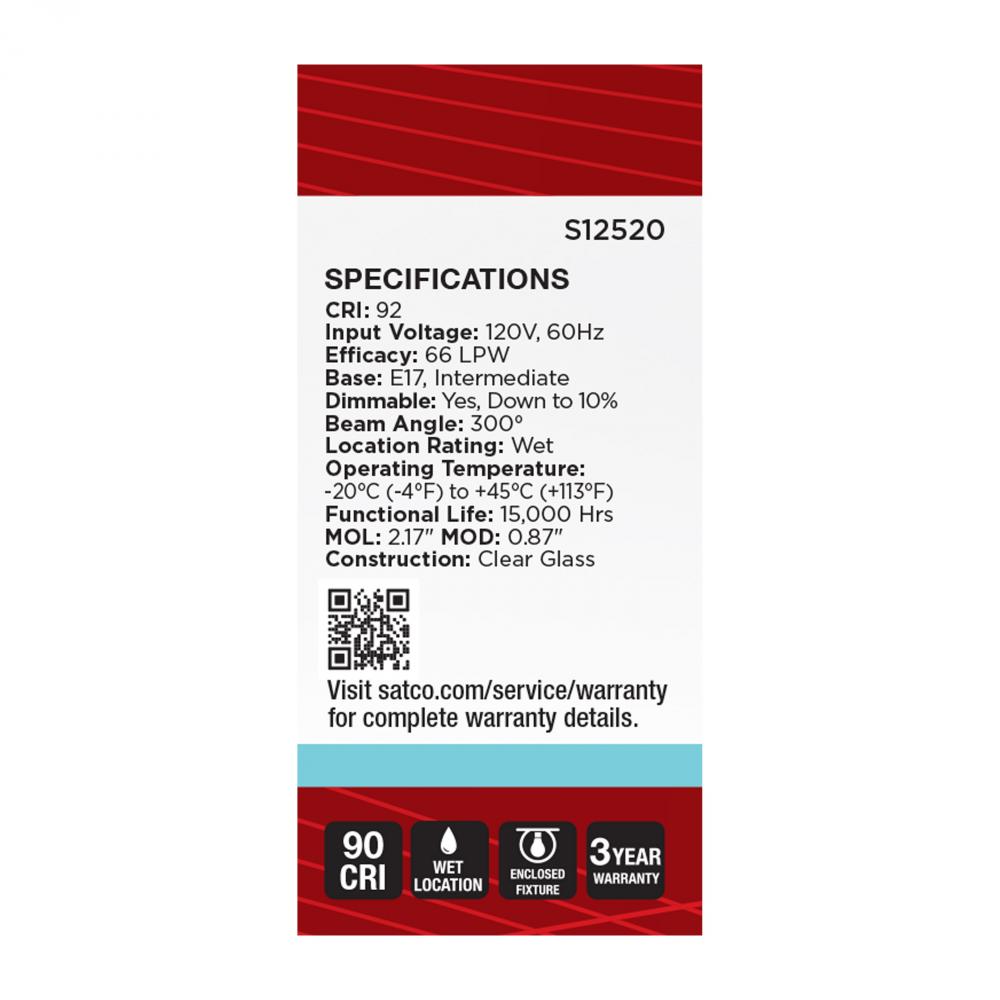 Satco's S12520 3-watt, LED lamp is traditional, yet contemporary with its vintage style and energy saving LED technology. Elegantly illuminate any room in the house with this dimmable, clear bulb. Sophisticated and modern, this lamp delivers 15,000 hou