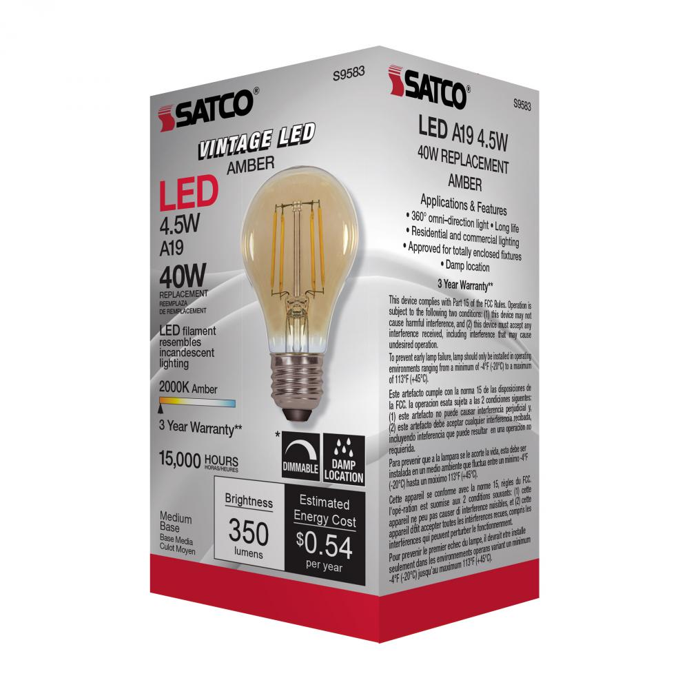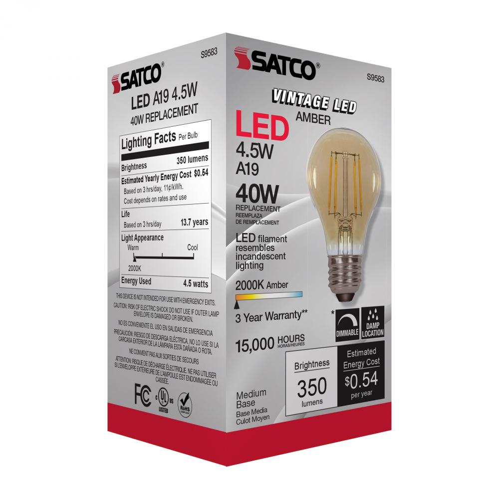 4.5 Watt A19 LED Filament; Amber; Medium base; 2000K; 350 Lumens; 120 Volt
