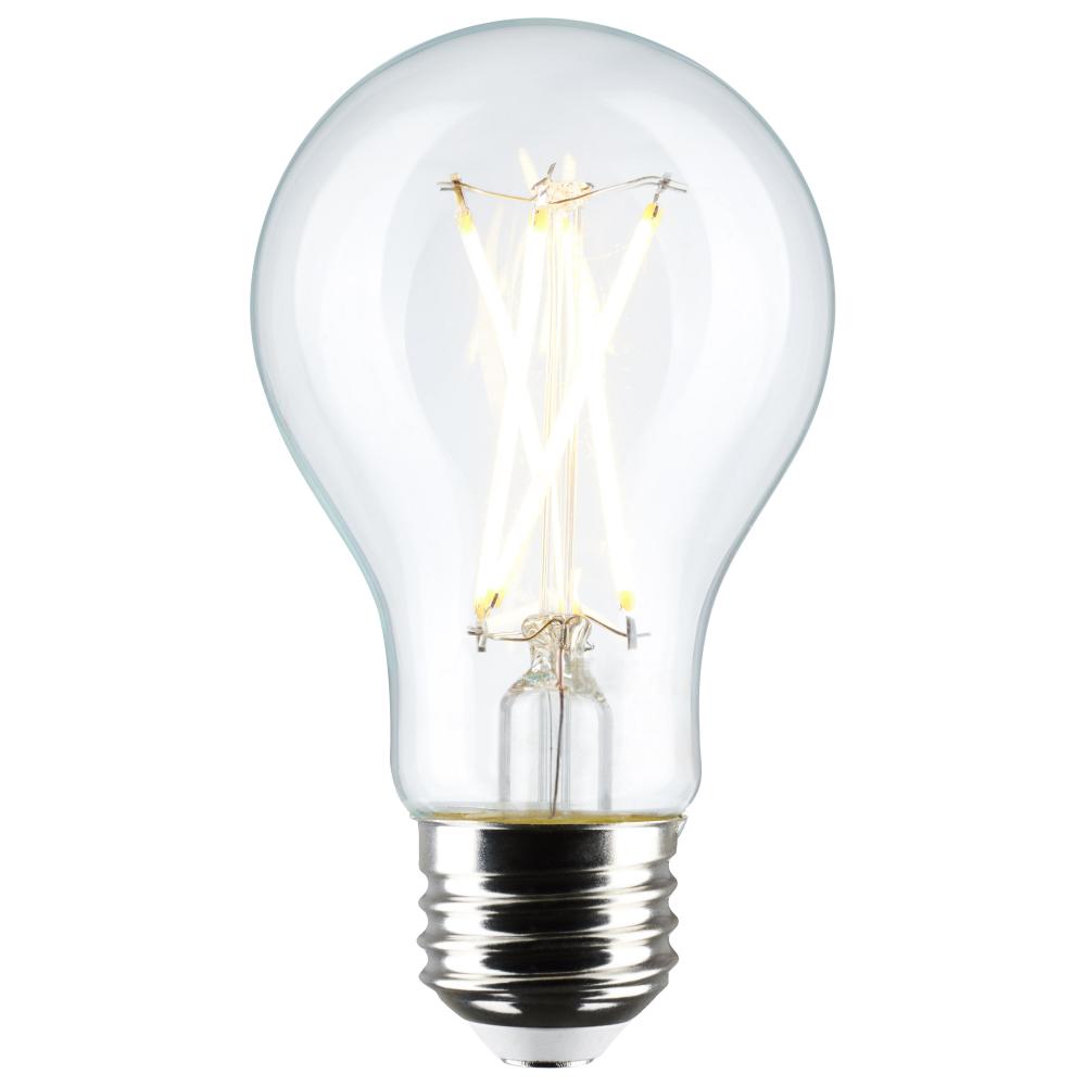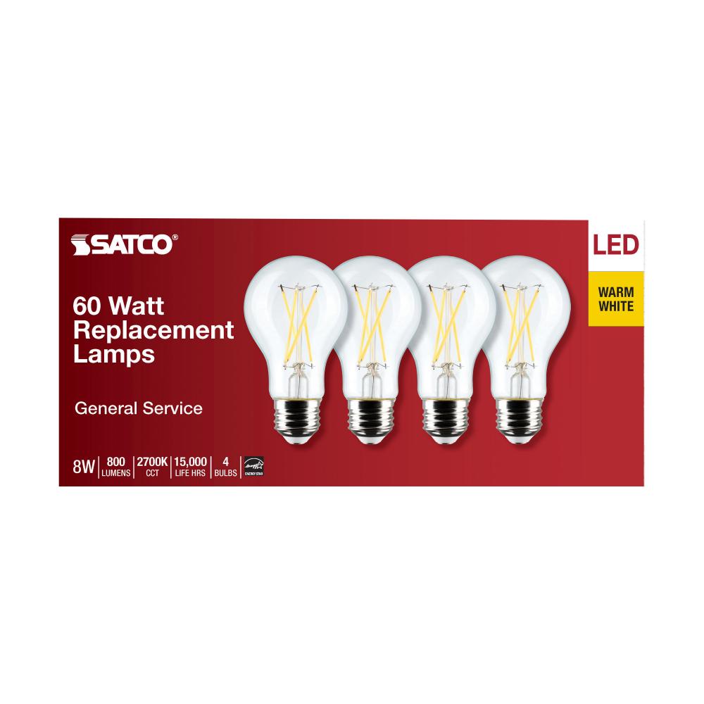 Satco's 8-watt, A19 LED bulb with a medium base is dimmable and offers warm white light with a 280 degree beam spread. Wet rated for use in kitchens and bathrooms, this clear bulb is sold in a convenient 4-pack. Elegant and long-lasting, this clear bul