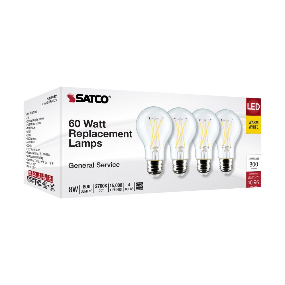 Satco's S12462 8-watt, A19 LED bulb with a medium base is dimmable and offers warm white light with a 280 degree beam spread. Wet rated for use in kitchens and bathrooms, this clear bulb is sold in a convenient 4-pack. Elegant and long-lasting, this cl