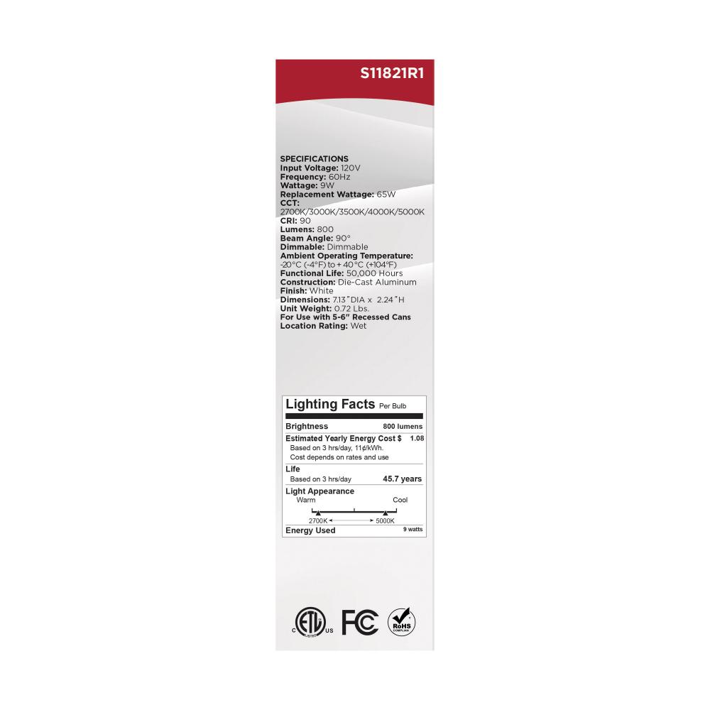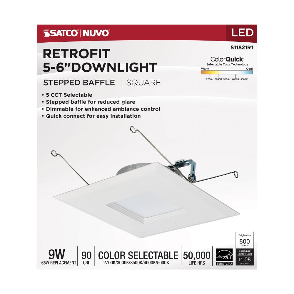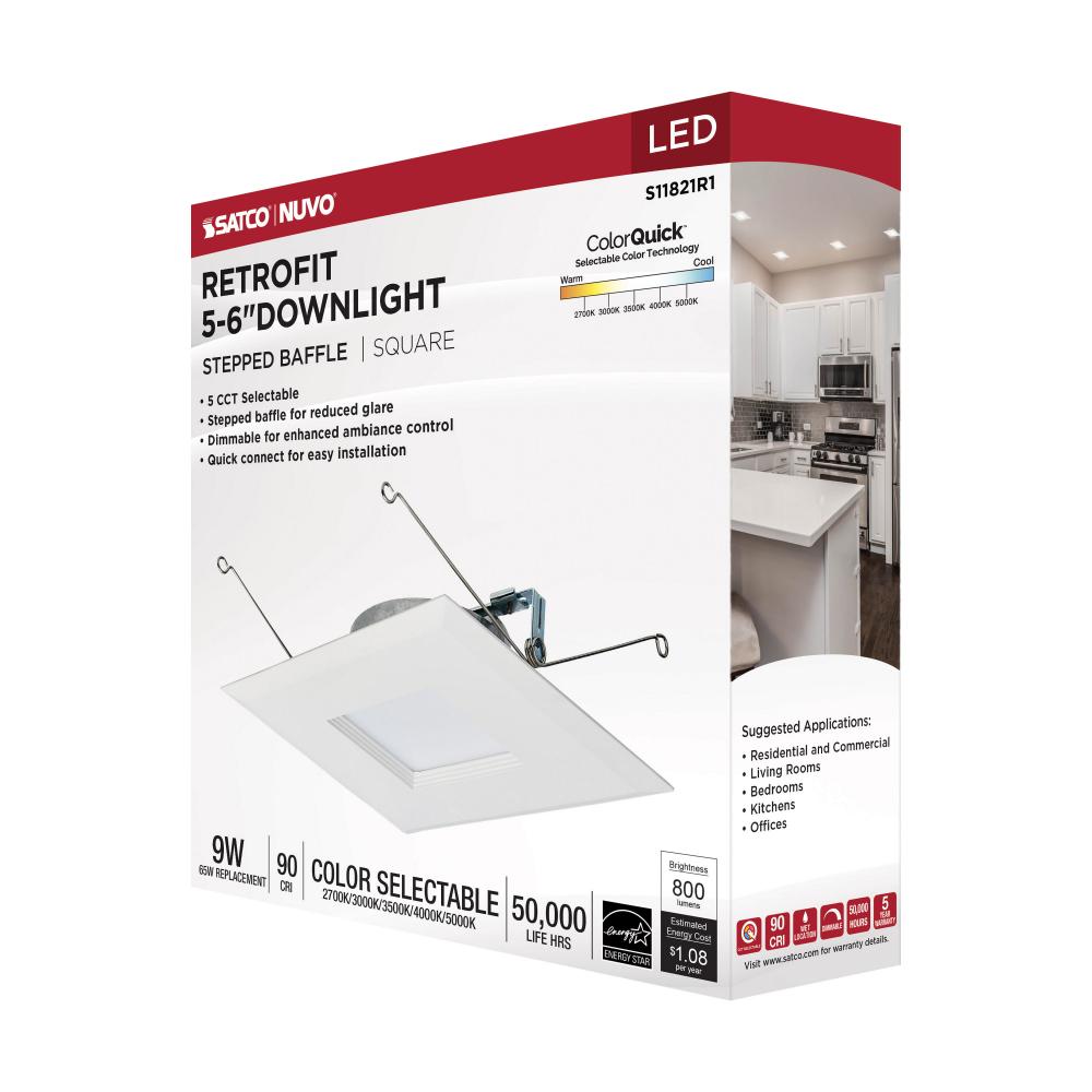9 Watt LED Downlight Retrofit; 5-6 Inches; CCT Selectable; Square; White Finish; 120 Volt