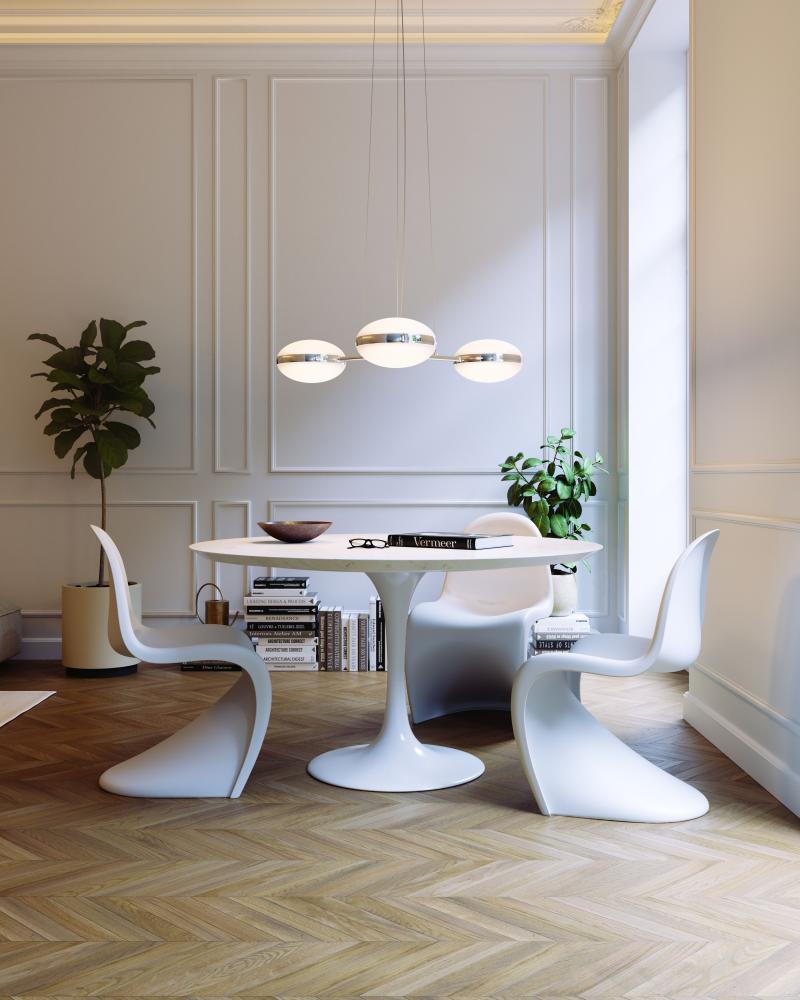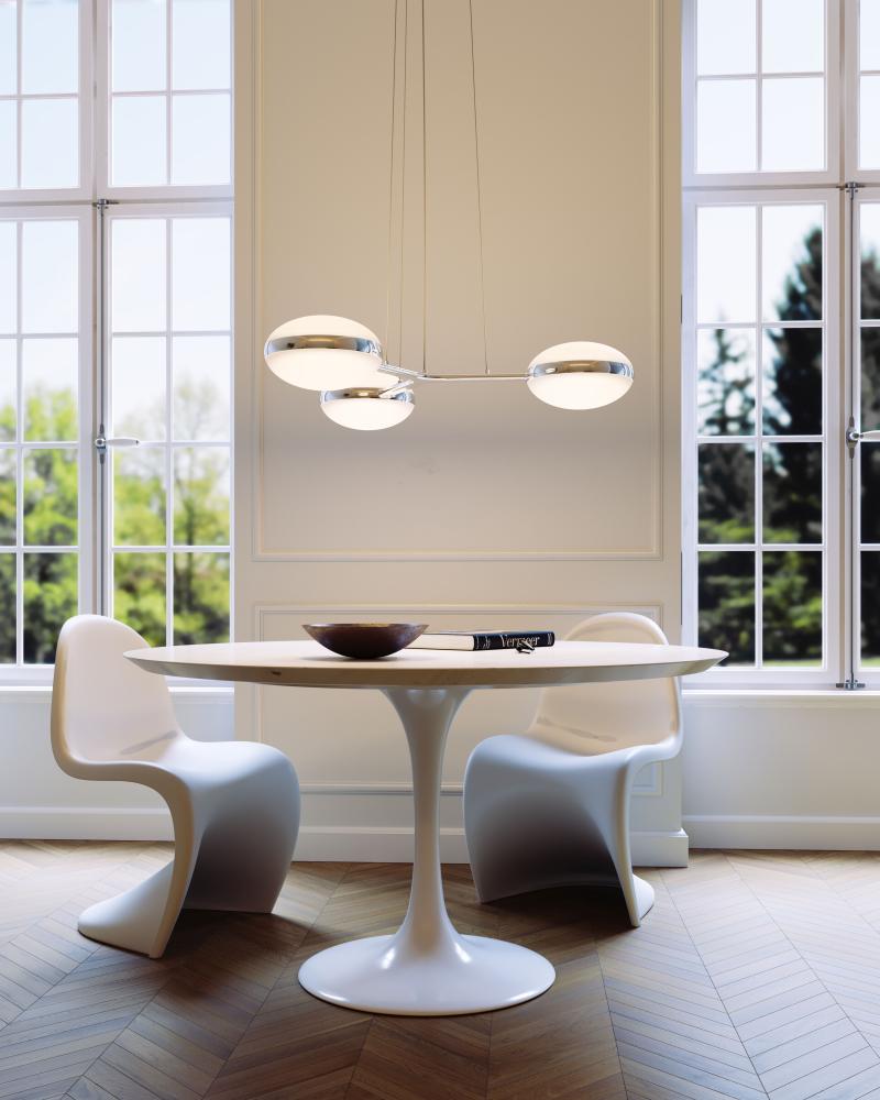 This collection of Sconces and Chandeliers feature an oval acrylic dome and lightweight aluminum frame, creating evenly diffused LED light. Pillows celebrates the optical effect of calming curvilinear form and flowing metal enclosure. Pillows Chandeliers are available in multiple configurations. Each chandelier is conducive for spaces with low or high ceilings. The entire collection is available in Brass Finish, Polished Chrome, and Satin Black. Scaled for residential, hospitality and commercial settings for an enduring modern presence.