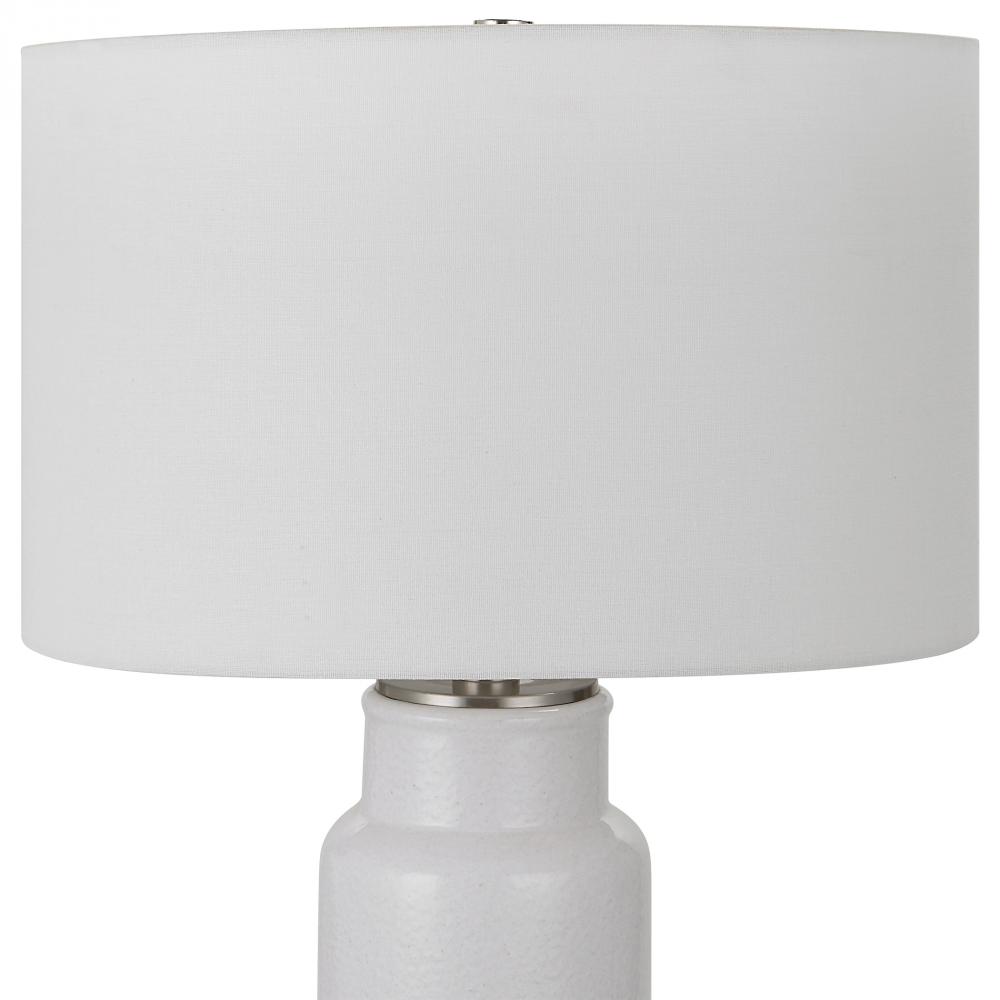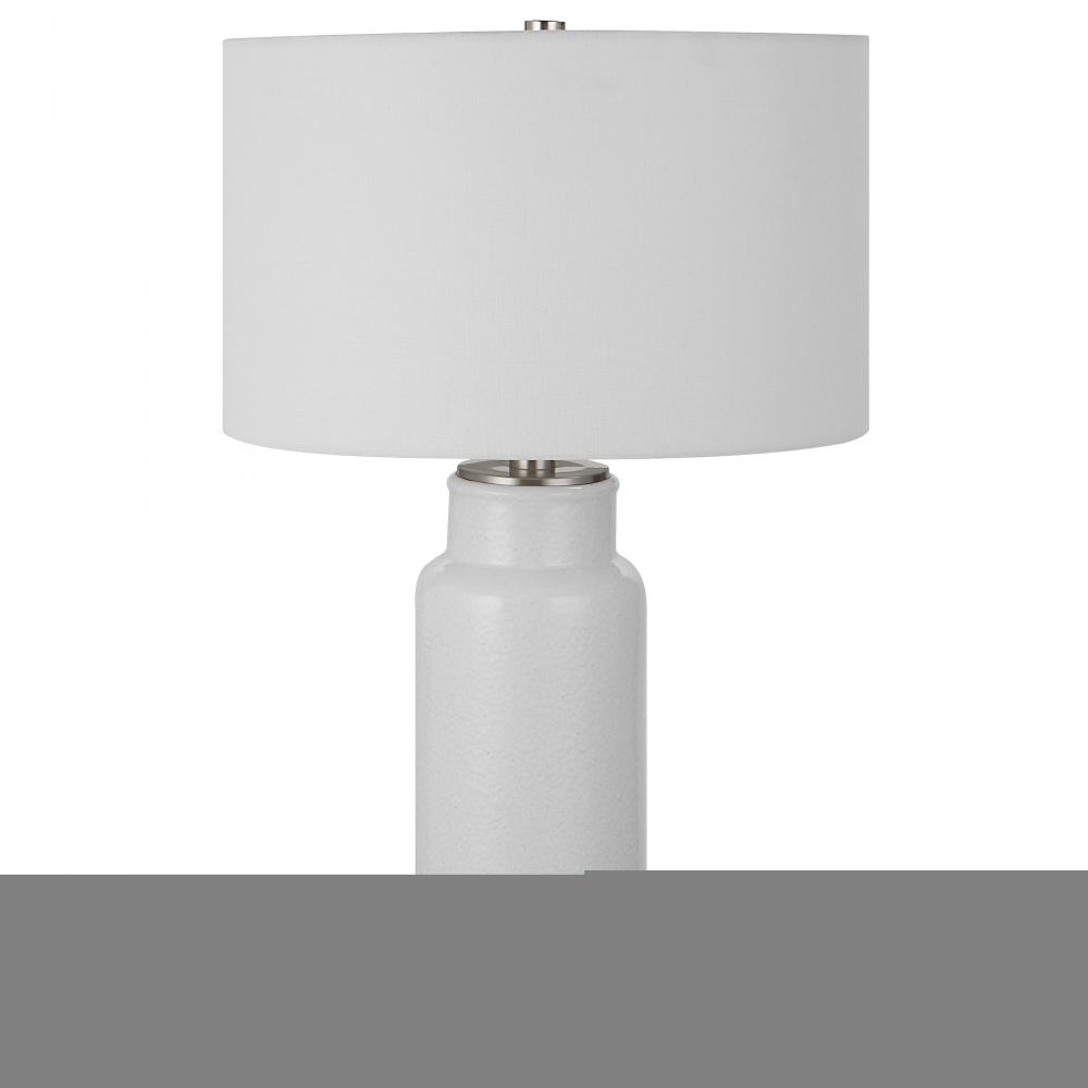 Inspired By Farmhouse Style Pottery, This Table Lamp is Handcrafted From Ceramic Finished in A Textured White Glaze with A Natural Bottom, Paired with Plated Brushed Nickel Accents. A White Drum Shade Complements This Piece.