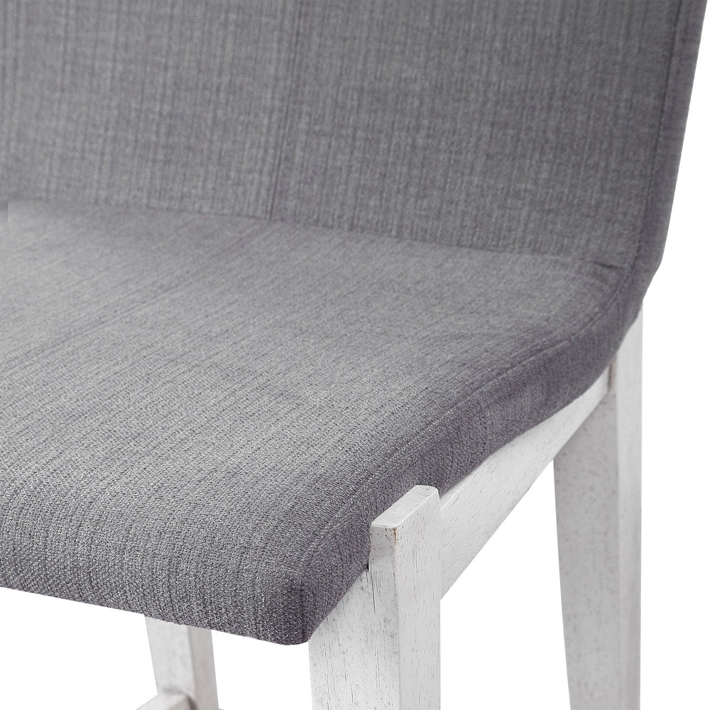 Gently Sloped Padded Seat in A Charcoal Linen Blend Performance Fabric Rests Within A Solid Wood Frame Finished in Aged White, with A Brushed Nickel Metal Kick Plate. Seat Height is 25".