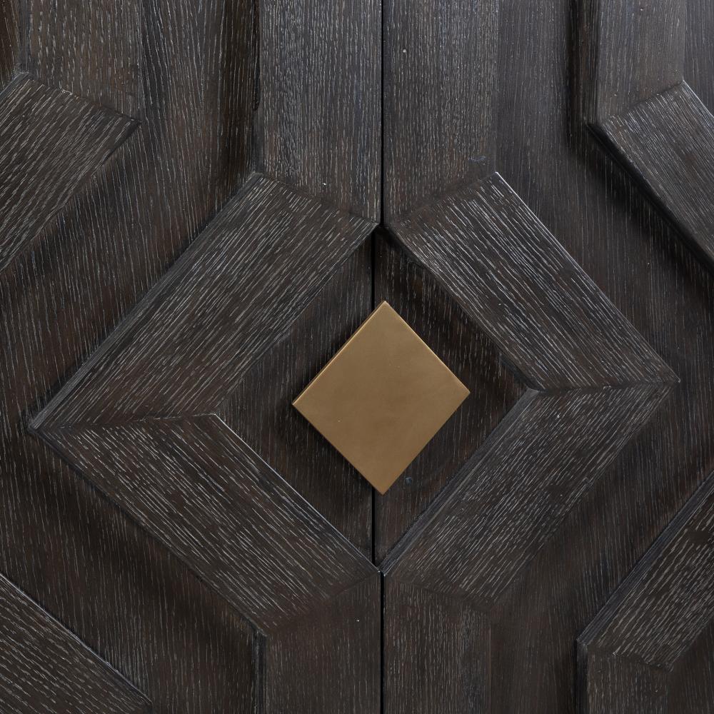 This Elegant Four-door Cabinet Beautifully Merges Contemporary Charm With Modern Sophistication. The Cabinet Showcases Both Beautiful Oak Grains In A Stunning Chevron Pattern And Brushed Gold Metal Door Pulls For A Touch Of Luxury.