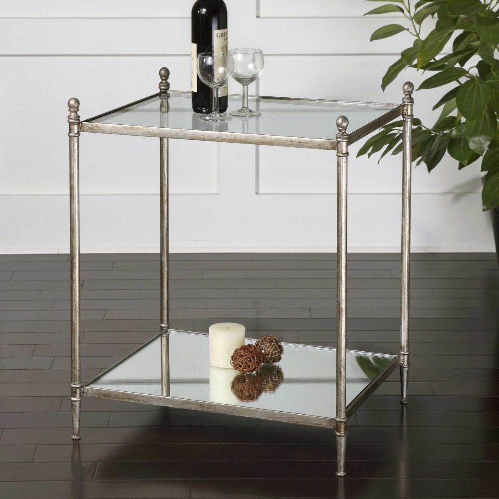 Forged Iron Frame in Antiqued Silver Leaf with Clear, Tempered Glass Top and Mirrored Gallery Shelf.