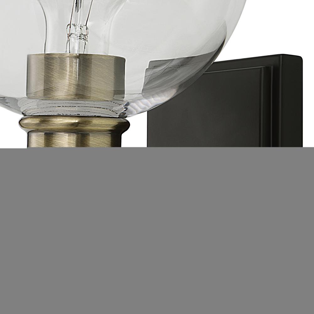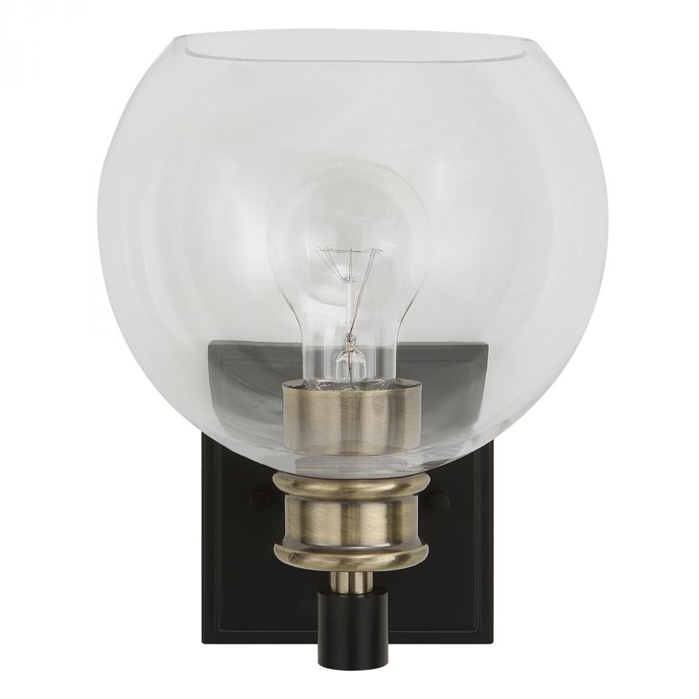 Timeless Lines Make This 1 Lt. Sconce An Understated Classic. Finished in A Combination of Matte Black & Plated Antique Brass Then Topped with Sparkling Clear Round Glass Shade. 1-60 Watt Max, Edison Socket. Bulbs Not Included.